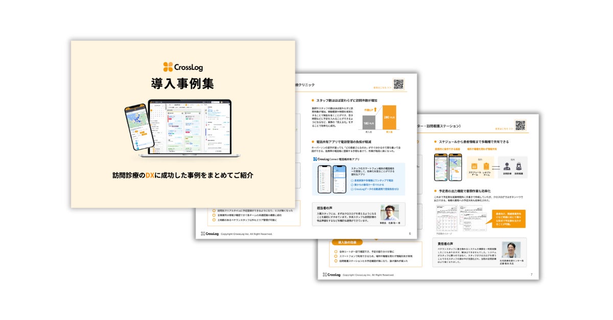 CrossLogは、訪問診療サービスを提供する医療機関のスケジュール管理をはじめとした業務の効率化を実現するソフトです。