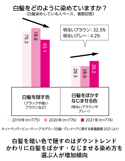 グレイヘア世代においても「暗く染めて隠す」従来の白髪染めから、ここ数年で白髪を「ぼかす」「なじませる」色でヘアカラーする人の割合が増えています。