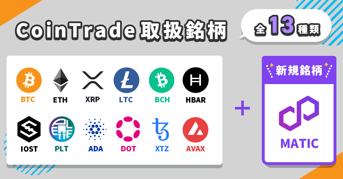 当社の提供するサービス「CoinTrade(コイントレード)」において、本年6月1日取扱い開始となるポリゴン(MATIC)を加え、13銘柄の取扱いとなりました。