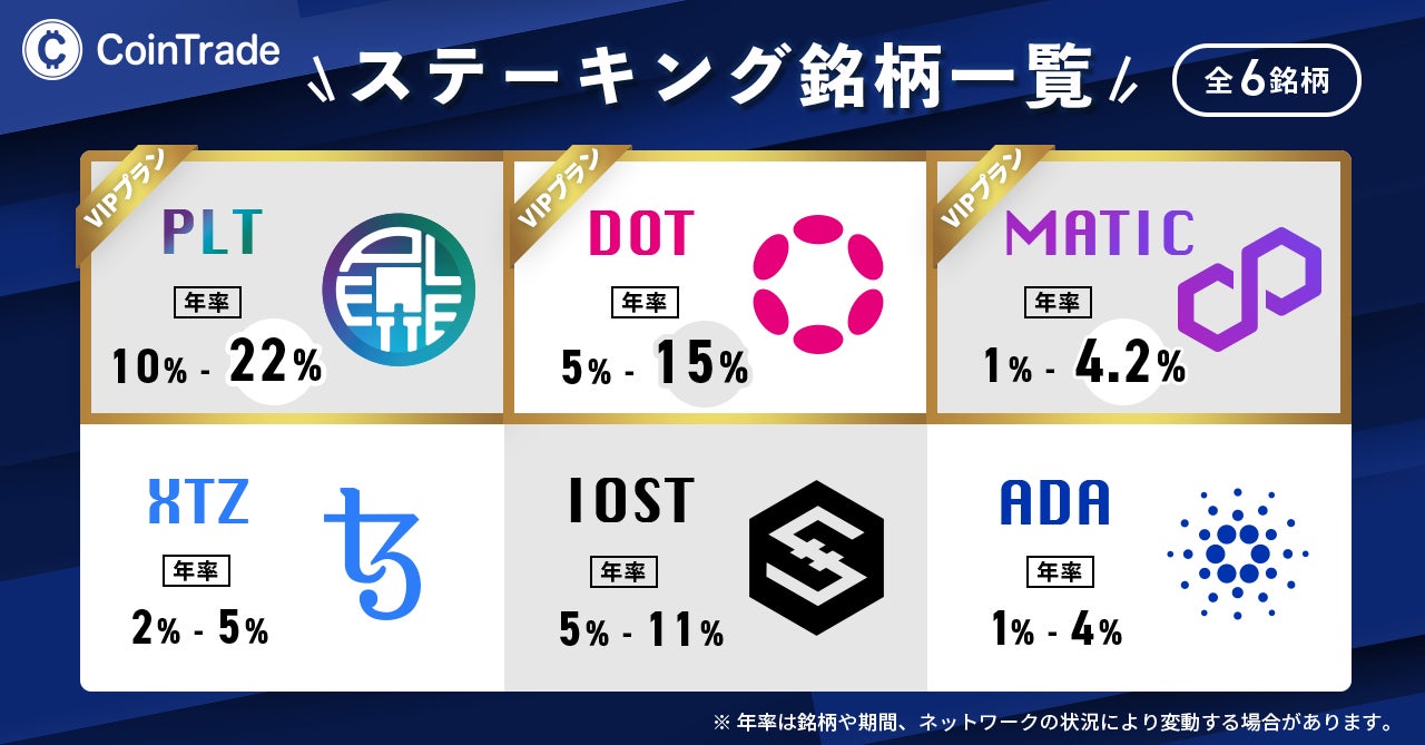 あわせて「CoinTradeStake(コイントレードステーク)」においてもポリゴン(MATIC)の取り扱い開始に伴い、6銘柄のステーキングサービスを提供可能となりました。