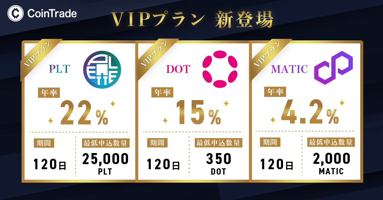 また、「CoinTradeStake(コイントレードステーク)」ではポリゴン(MATIC)取り扱い開始を機に、より一層お客様のニーズに応えるべく、新たにVIPプランを提供することをお知らせいたします。