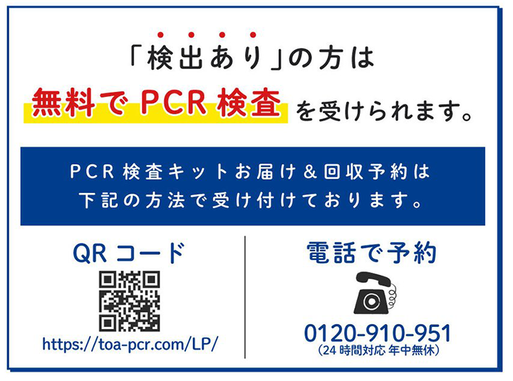 - 本検査キットで抗原検出ありの結果が出た場合、無料でPCR検査を受けることが可能です。