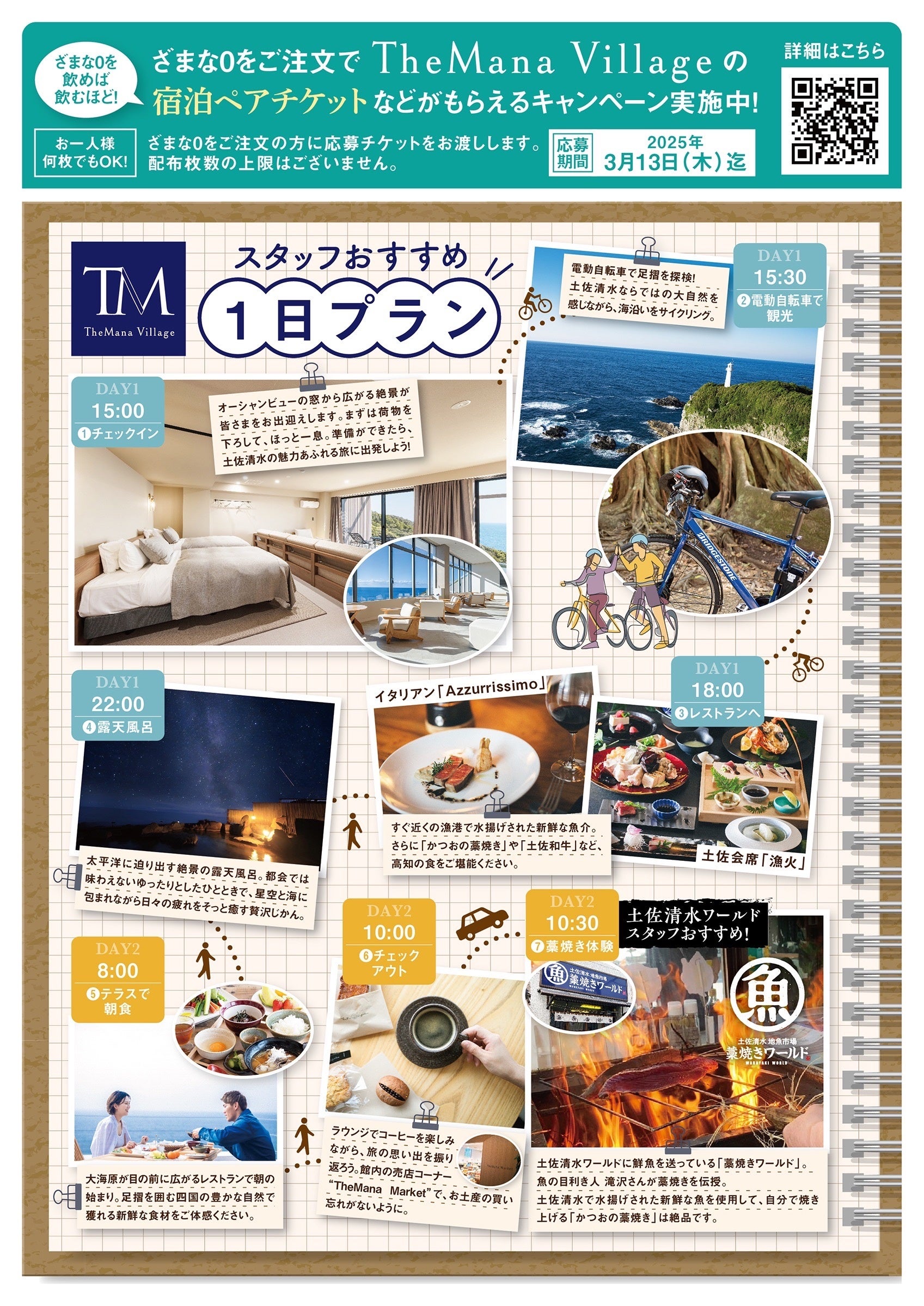 期間中に「ざまな0」を注文した方を対象に 「TheMana Village」スイートルームペア宿泊チケット(食事付き)などが当たる抽選会を実施します。また、「TheMana Village」公式 Instagram をフォローすると、ホテルロゴ入り「宗田だしパック」をプレゼントいたします(各店舗なくなり次第終了)。