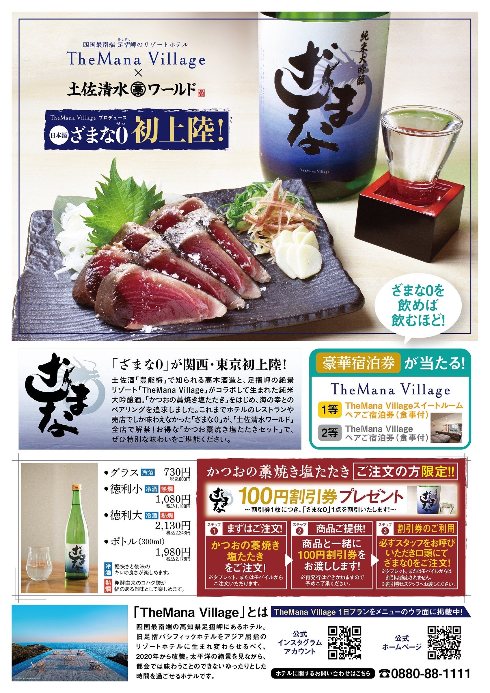 高知県足摺岬の絶景リゾート「TheMana Village」と高木酒造のコラボ日本酒「ザマナ0(ゼロ)」が「土佐清水ワールド」9店舗で期間限定提供!ペア宿泊チケットが当たる抽選キャンペーンも実施