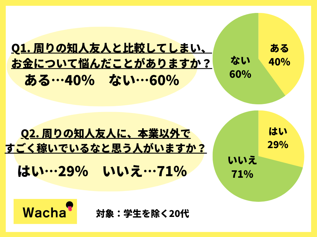 Q1. 周りの知人友人と比較してしまい、お金について悩んだことがありますか?という質問では、「ある」と回答した人が40%、「ない」と回答した人が60%になり、Q2. 周りの知人友人に、本業以外ですごく稼いでいるなと思う人がいますか?という質問では、「はい」は29%、「いいえ」が71%となりました。