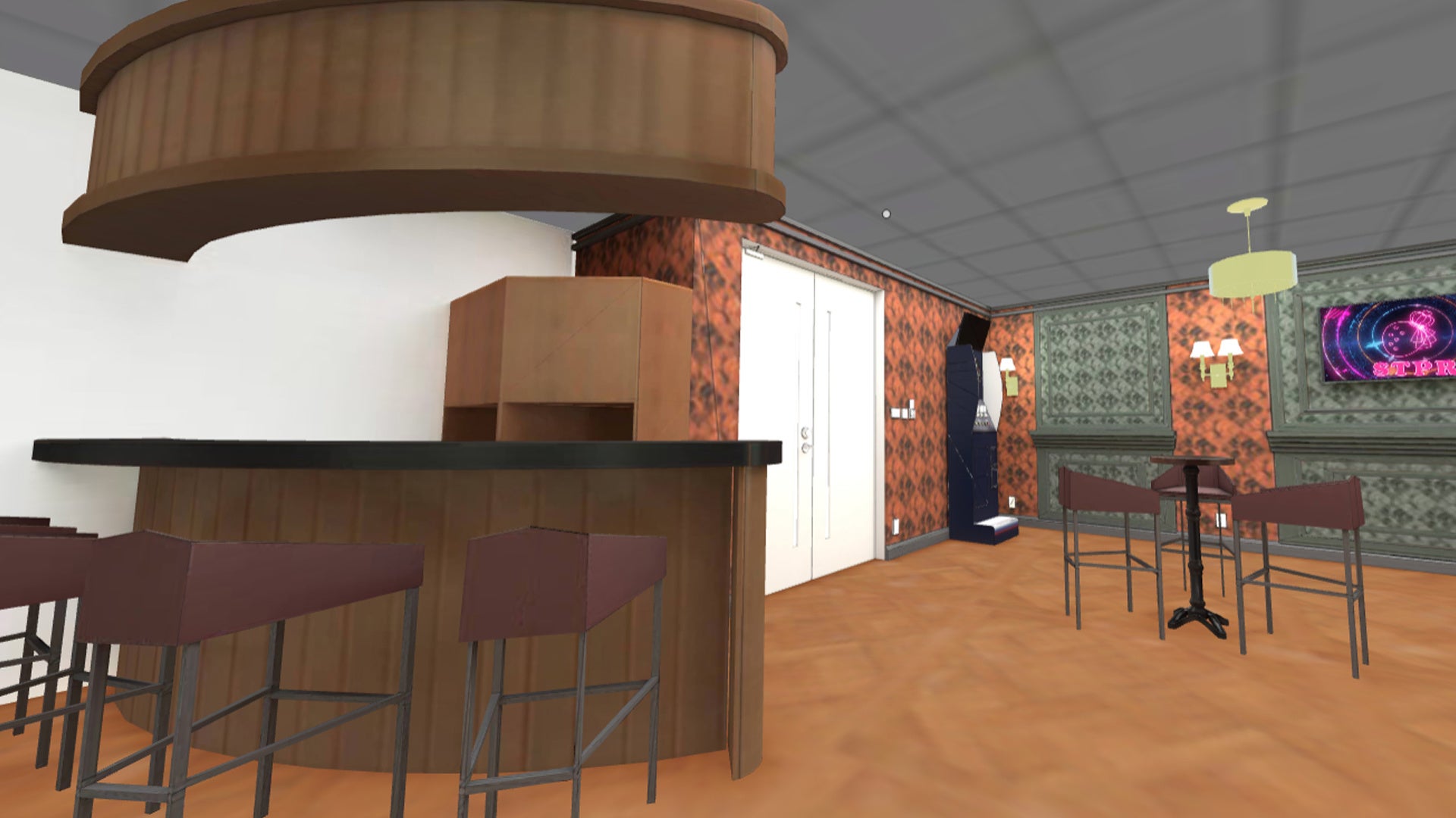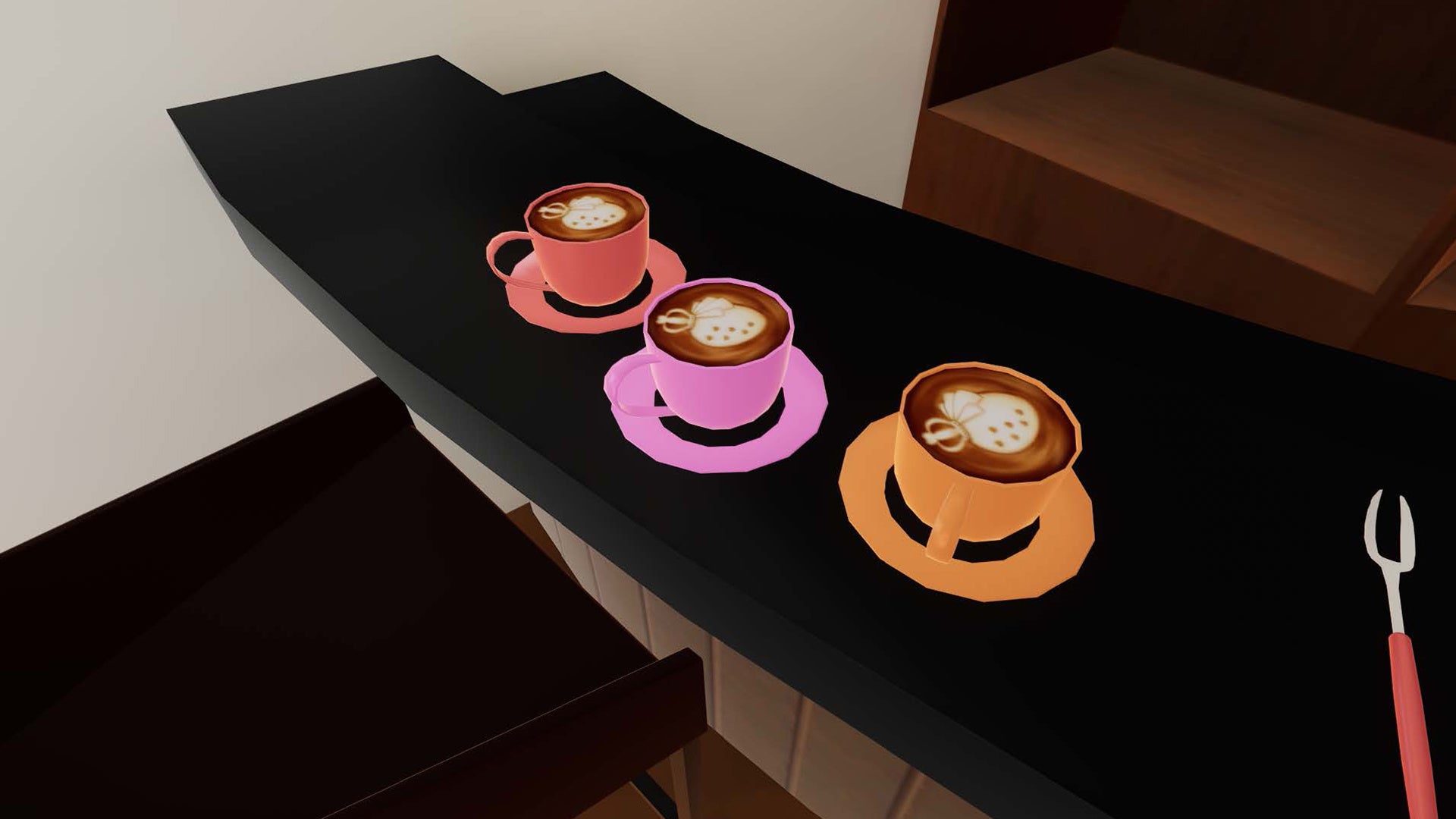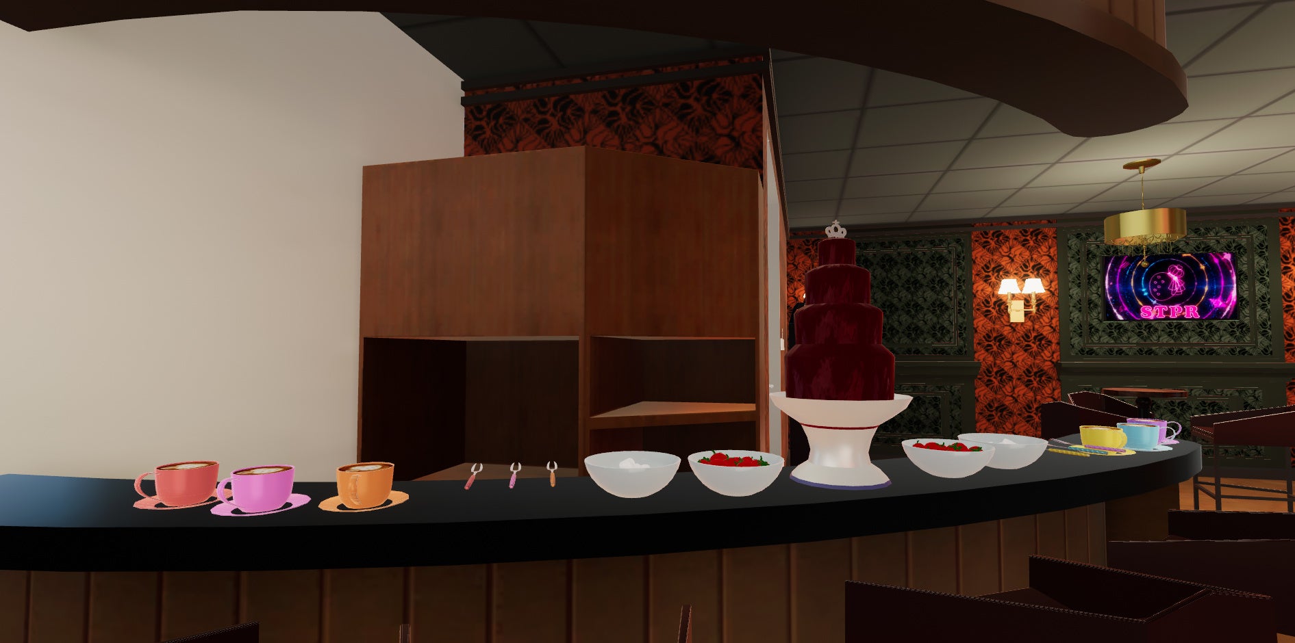 オフィスにあるBar Counterやハイチェアをワールド内に制作。Bar Counterではスイーツ体験ブースがあり、メンバーカラーのコーヒーカップには「すとぷり」の苺マークをラテアートで演出。またフォークを使い苺やマシュマロでチョコフォンデュをディップすることができます。