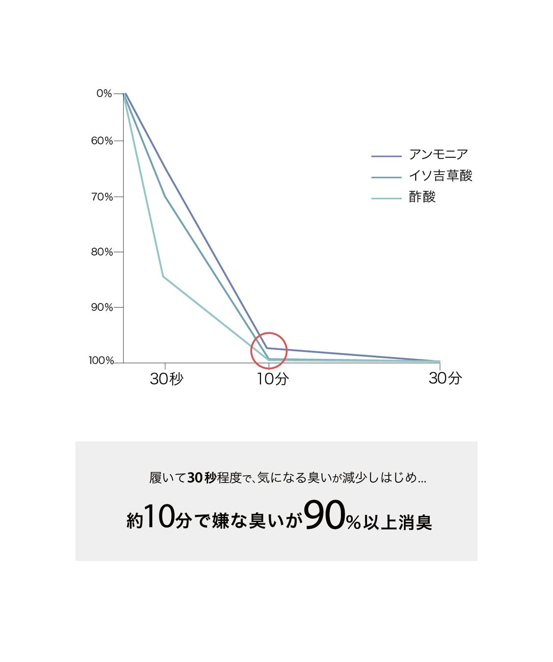 体感できる即効性 :履いて 30 秒程度で、気になる臭いが減少しはじめ、10 分で 90%以上が減少します。