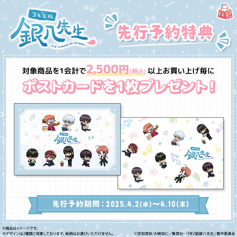 さらに、今ならECサイト「ココアニ」にて、先行予約期間中にTVアニメ『3年Z組銀八先生』の対象商品を、1会計で2,500円(税込)以上お買い上げごとに、先行予約特典「ポストカード(全2種)」をランダムで1枚プレゼントいたします。