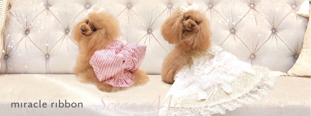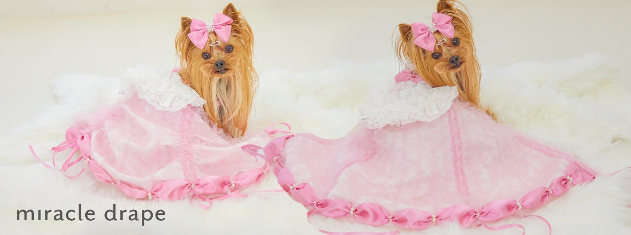 愛犬家の憧れのロングドレスは、愛犬が移動する際や排せつ時に負担になる場合があることから、簡単に動きやすいスタイルに変化するよう考案しました。この変化するミミーメリーの犬用ドレスは、現在特許申請中です。