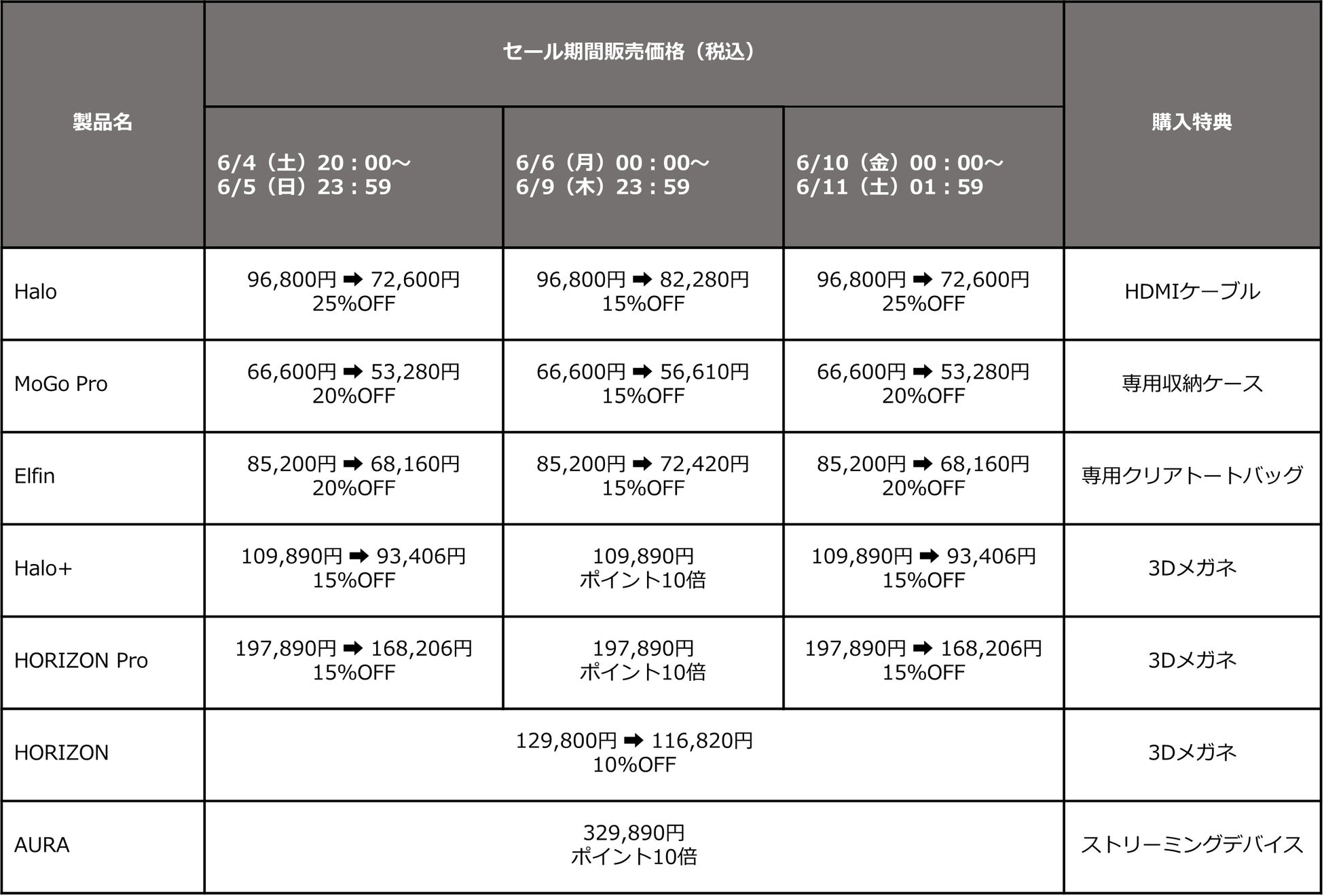 対象商品は、昨年発売された4Kプロジェクターの「XGIMI HORIZON Pro」や、全世界での売り上げが100万台を突破した「XGIMI Elfin」など、人気機種を含む全7モデルです。さらに、対象製品をご購入いただいた方を対象に、3Dメガネや専用収納ケースなどの豪華特典も用意しています。