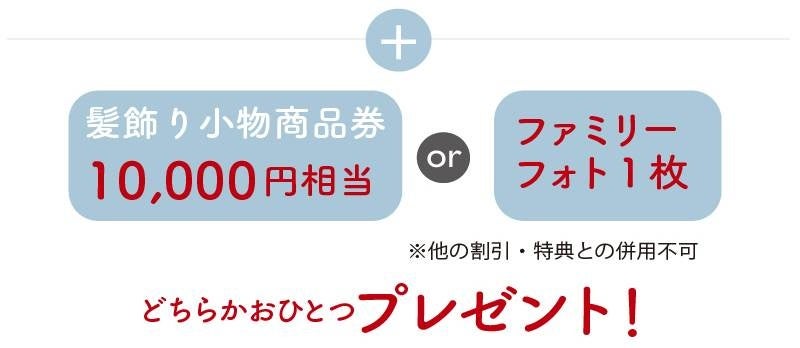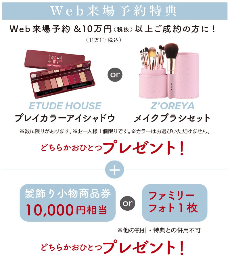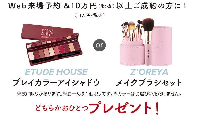 Web来場予約&11万円(税込)以上ご成約の方に「化粧品グッズ + 商品券orファミリーフォト」をプレゼントさせていただきます。