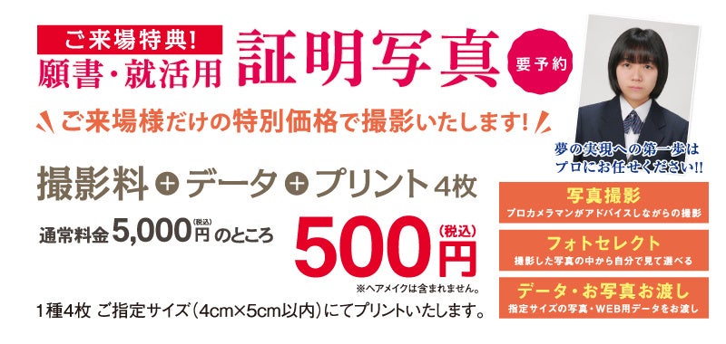 ご来場いただけた方には、願書・就活用の証明写真の撮影料+データ+プリント、通常料金5,000円(税込)を、500円(税込)で承ります。