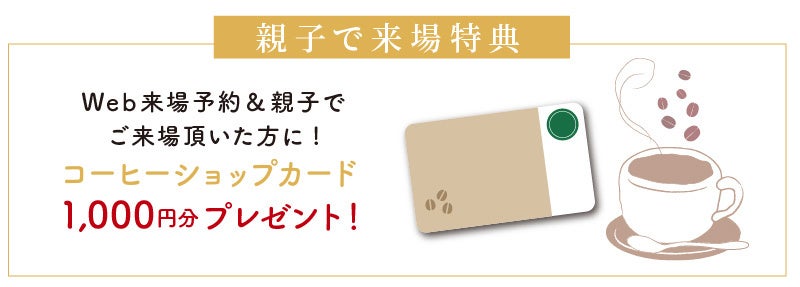 「Web来場予約 & 親子でご来場」を頂いた方に、コーヒーショップカード1,000円分プレゼントさせていただきます。