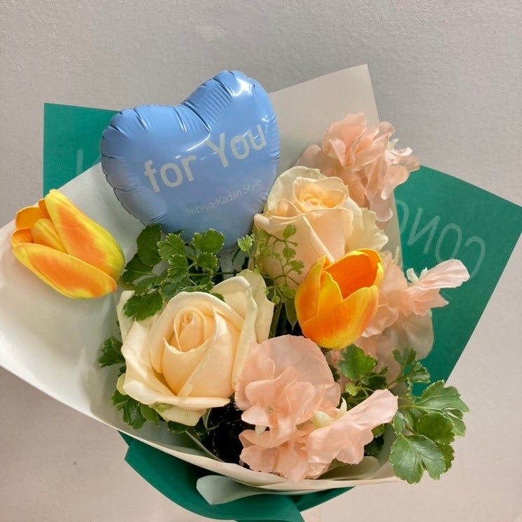 2025年の成人の日を控え、日比谷花壇の店頭では、オレンジ、ブルー、ピンクの色別に花言葉をもつバラをメインに、香り高い春の花々を合わせ、若年層に人気のハート型バルーンを添えた花束を発売します。バルーンは、想いが伝わる「for You」のメッセージが入った日比谷花壇オリジナルアイテムとなっています。