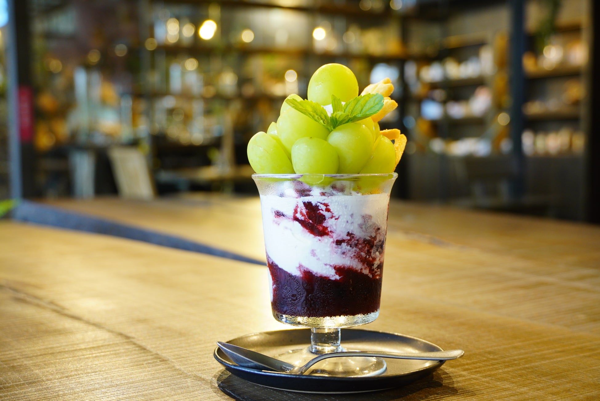 エントランスに隣接するカフェでは、地元のシャインマスカットをふんだんに味わえる贅沢パフェを販売。今だけの旬を味わって。
