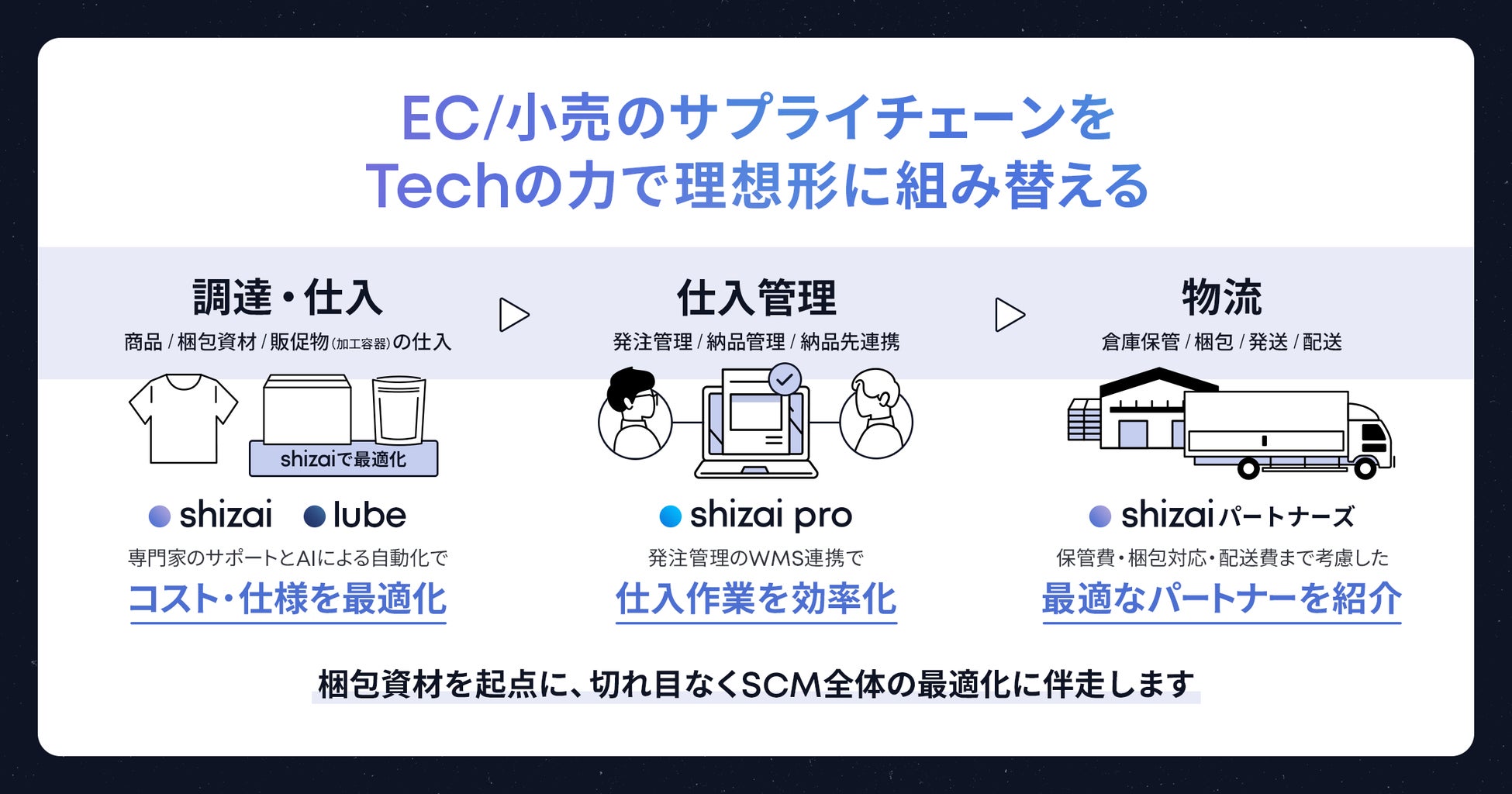 shizaiは包装資材プラットフォームのshizaiと、発注管理SaaS事業「shizai pro」の2事業を展開しております。この2つの自社事業を基軸としながら、さまざまなSCM領域パートナーの皆様のお力を借りてEC/小売のサプライチェーン全体を理想系に組み替えることを目指してまいります。