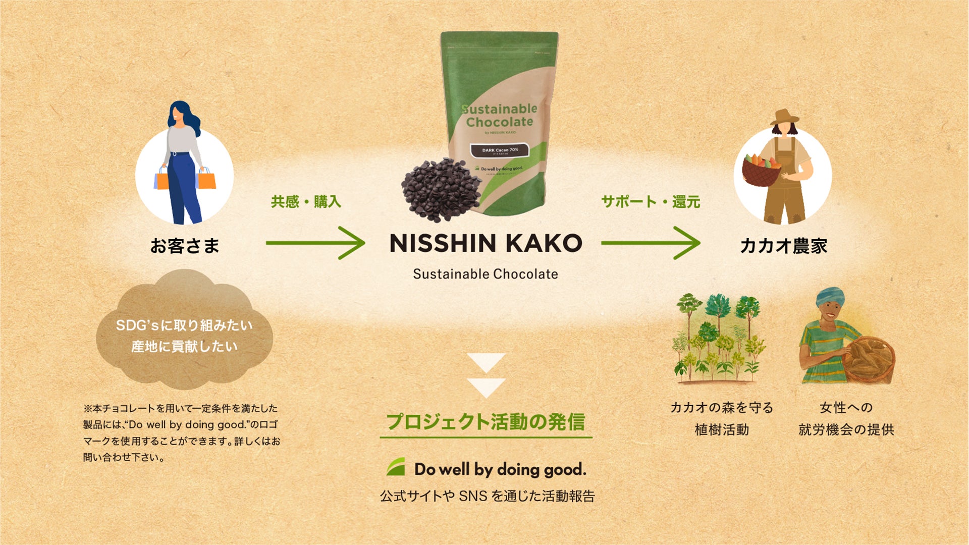 当社は、「Do well by doing good.」(=いいことをして世界と社会をよくしていこう)を体現した“サステナブルチョコレート”の製造販売を通じて、チョコレートの原料であるカカオ産業の抱える課題解決への取り組みと、その賛同の輪を広げる活動に取り組んでいます。