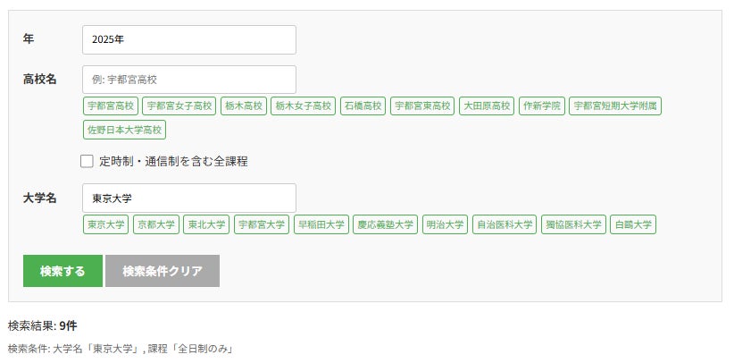 2023年度以降の高校別の大学合格実績を一覧で公開。「東京大学の合格者がいる高校」「特定の高校の合格実績」など、高校名や大学名で絞り込み検索ができ、進学実績から志望校を検討できます。