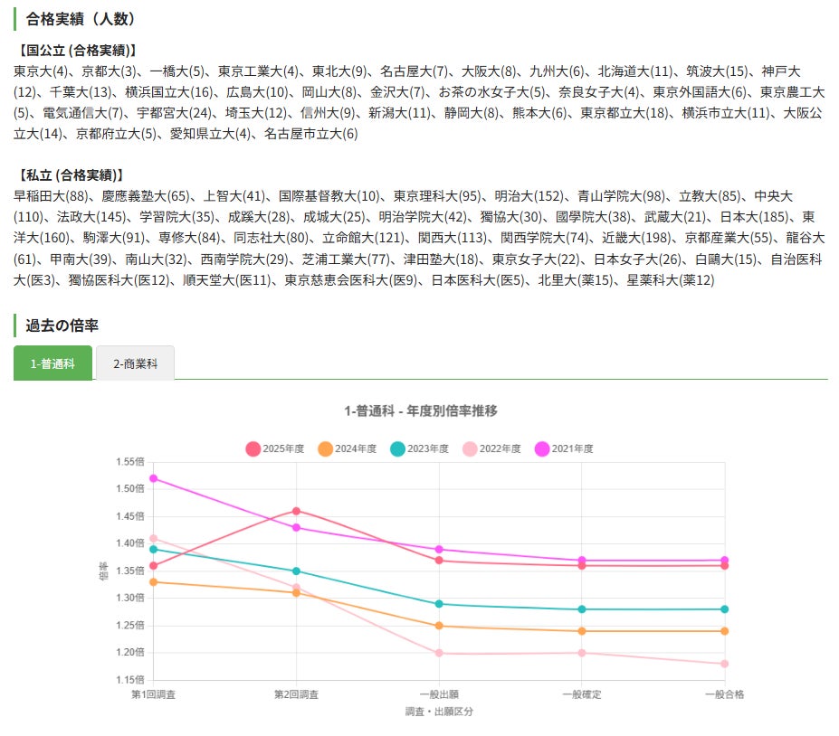 2021年度以降の県立高校(全日制)の志望・出願倍率の推移を学校・学科別にグラフ化。「昨年より人気が上がっているか」「進路希望調査と出願時ではどちらの倍率が高い傾向にあるか」といった動向が一目で分かります。