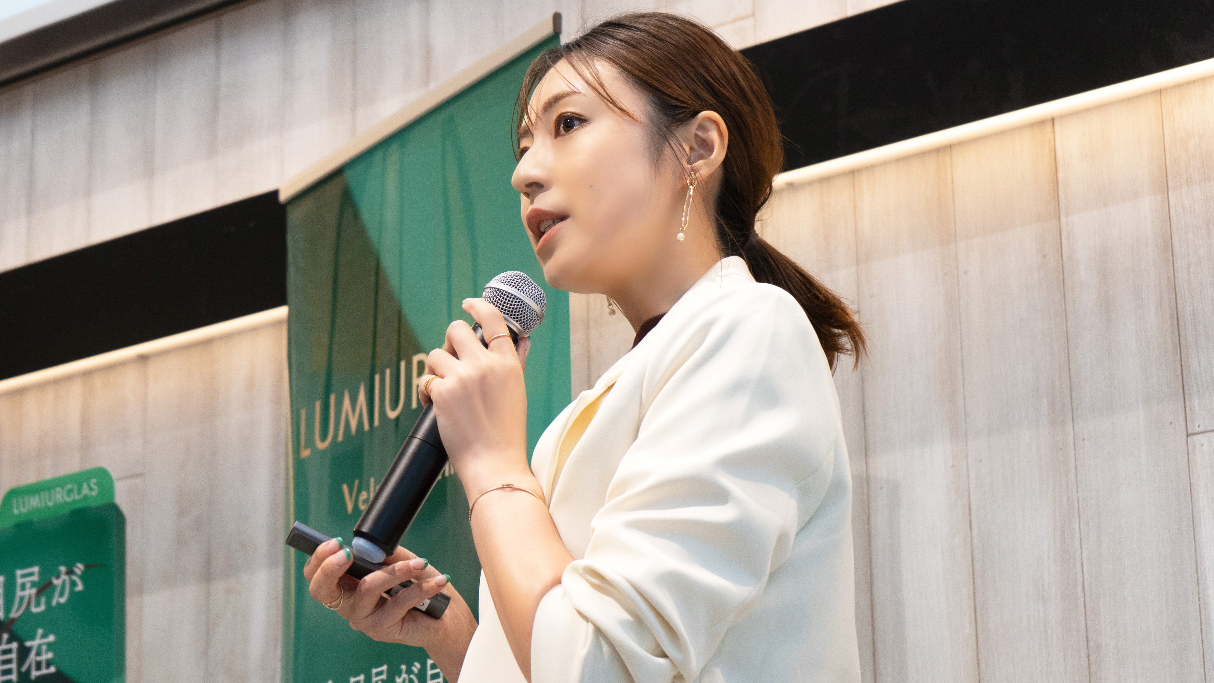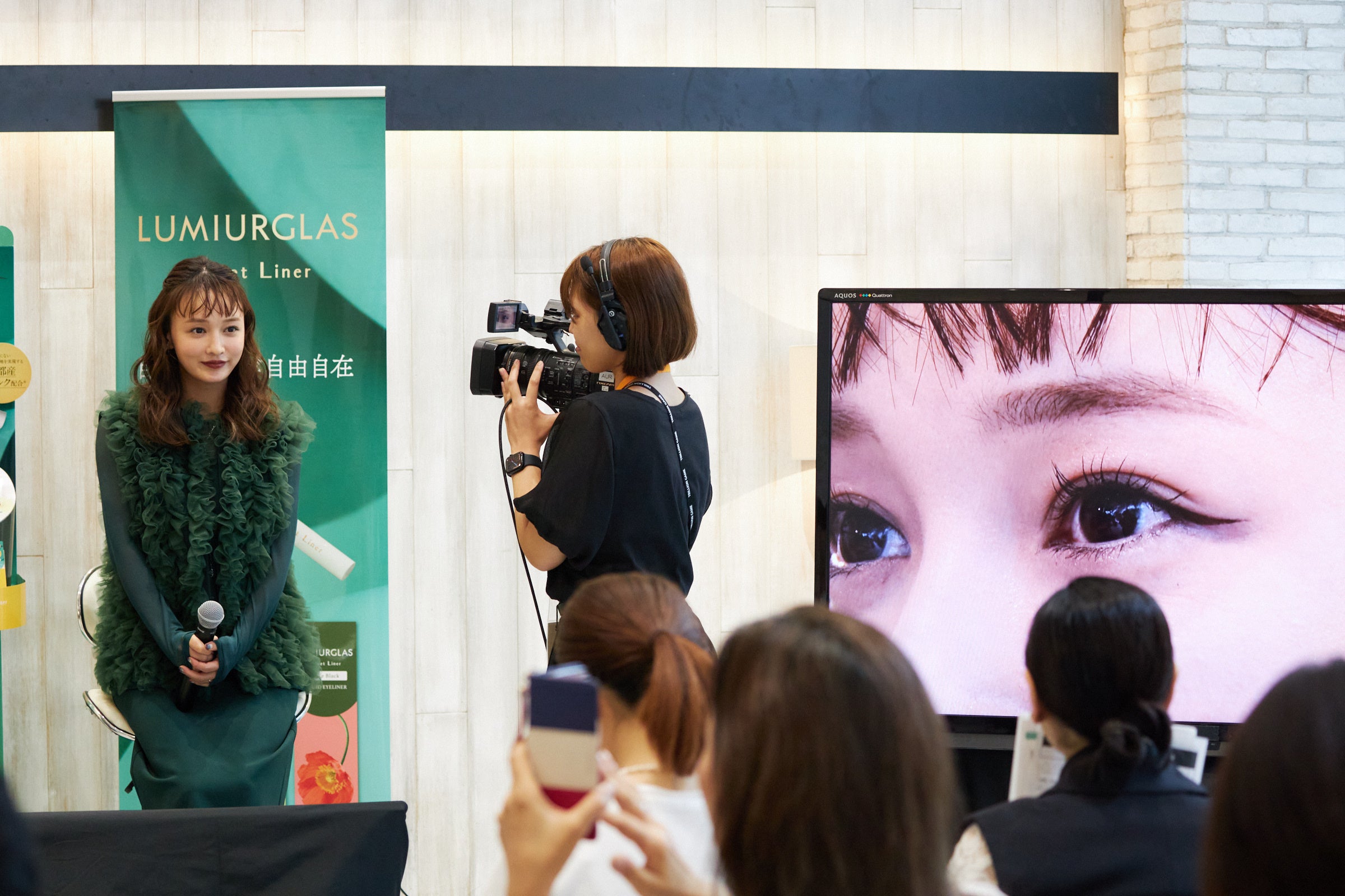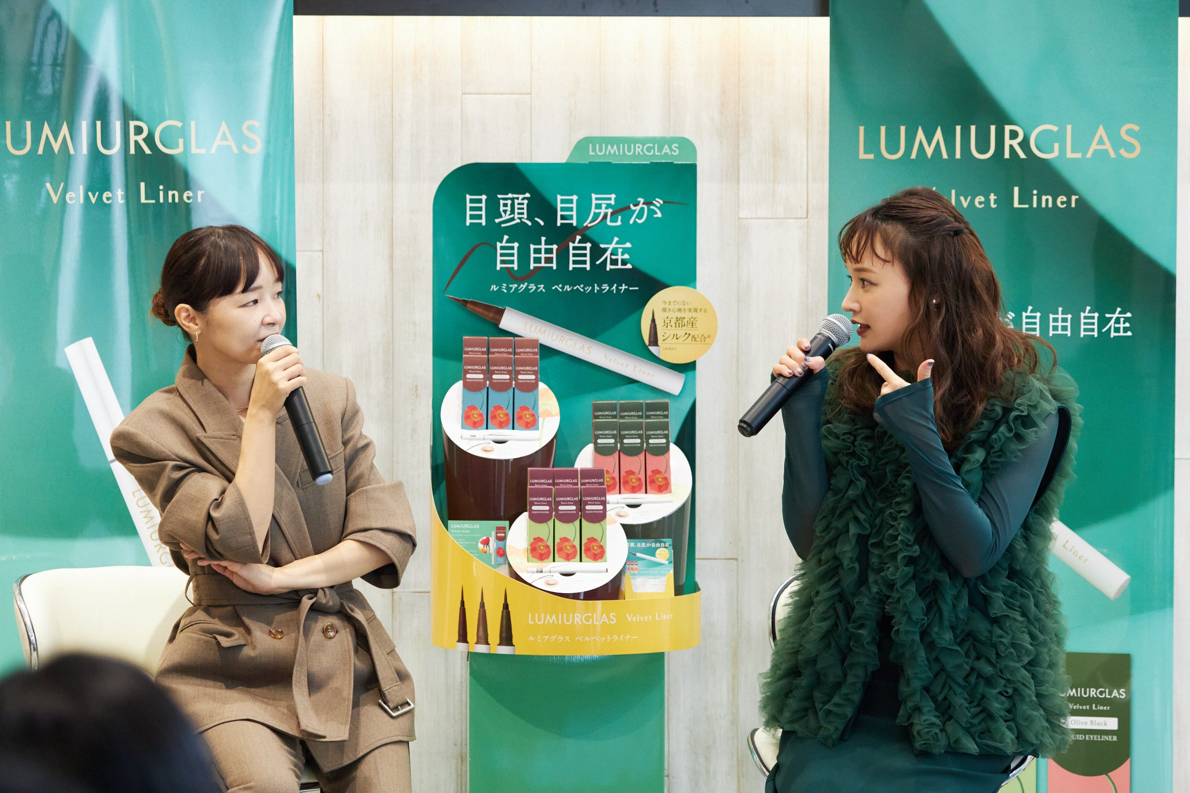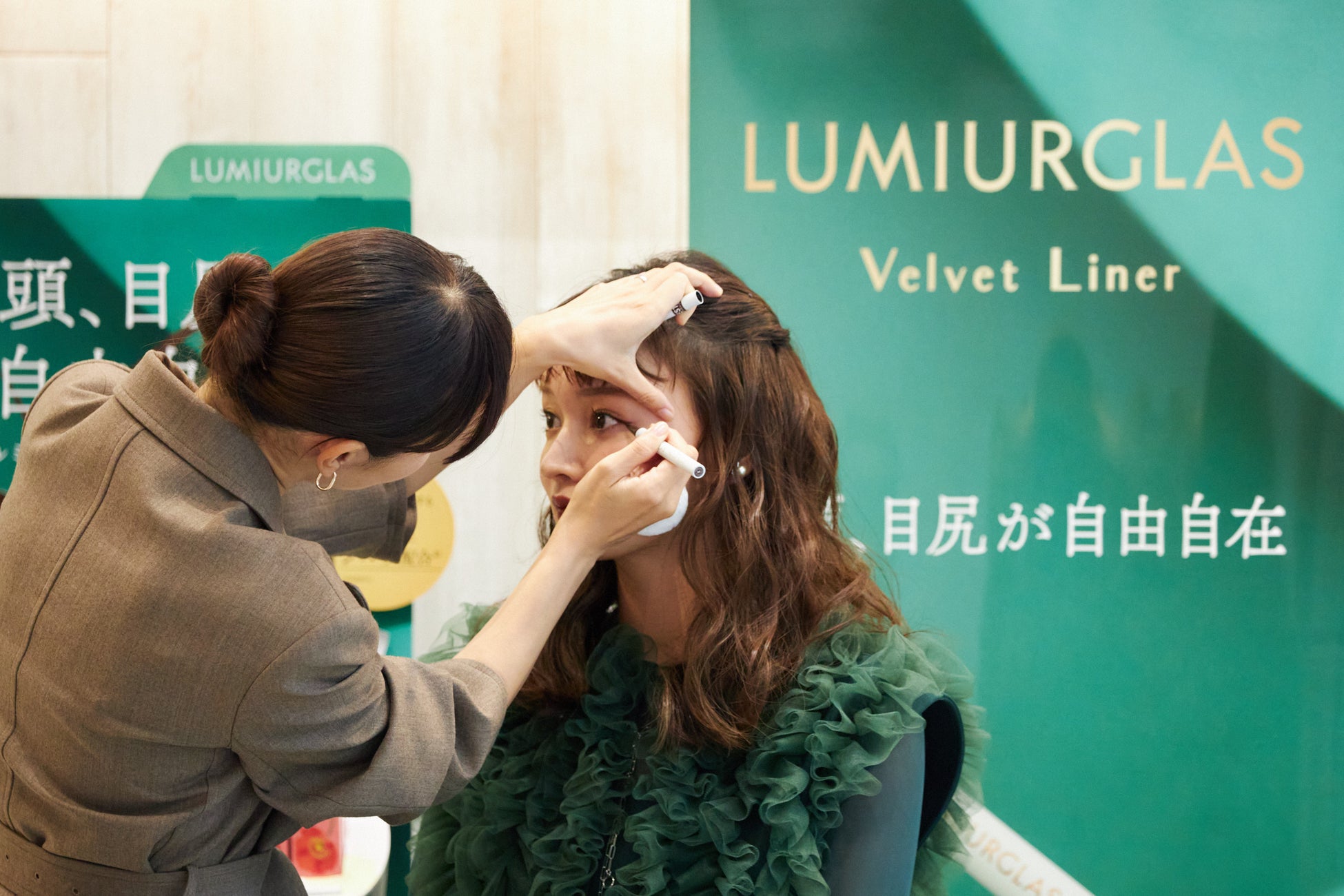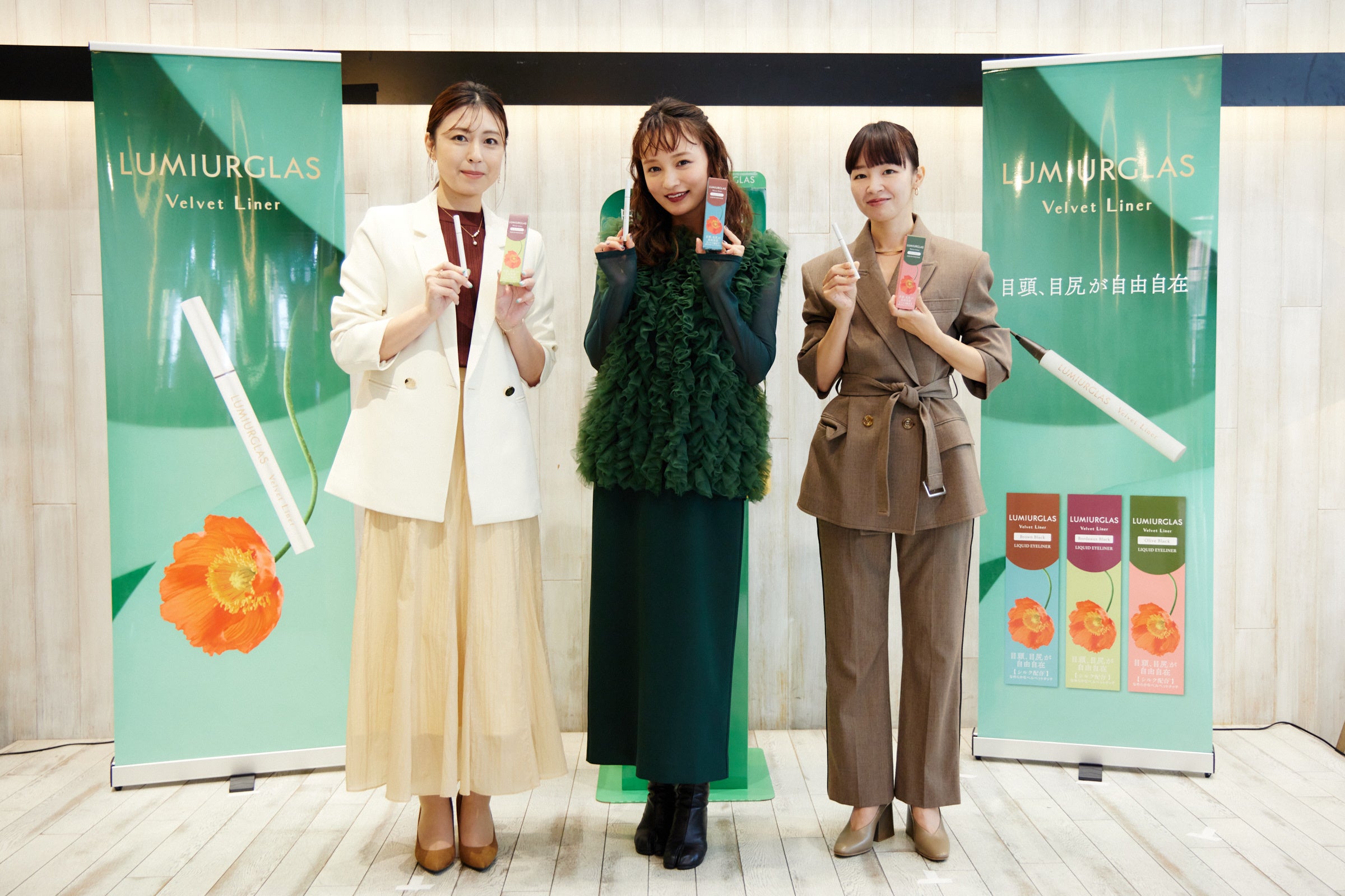 ルミアグラス「ベルベットライナー」新商品発表会を開催。𠮷﨑沙世子さんが“今年の秋冬メイクトレンド”を語り。わたなべ麻衣さんは“目尻アイライン”を実演。