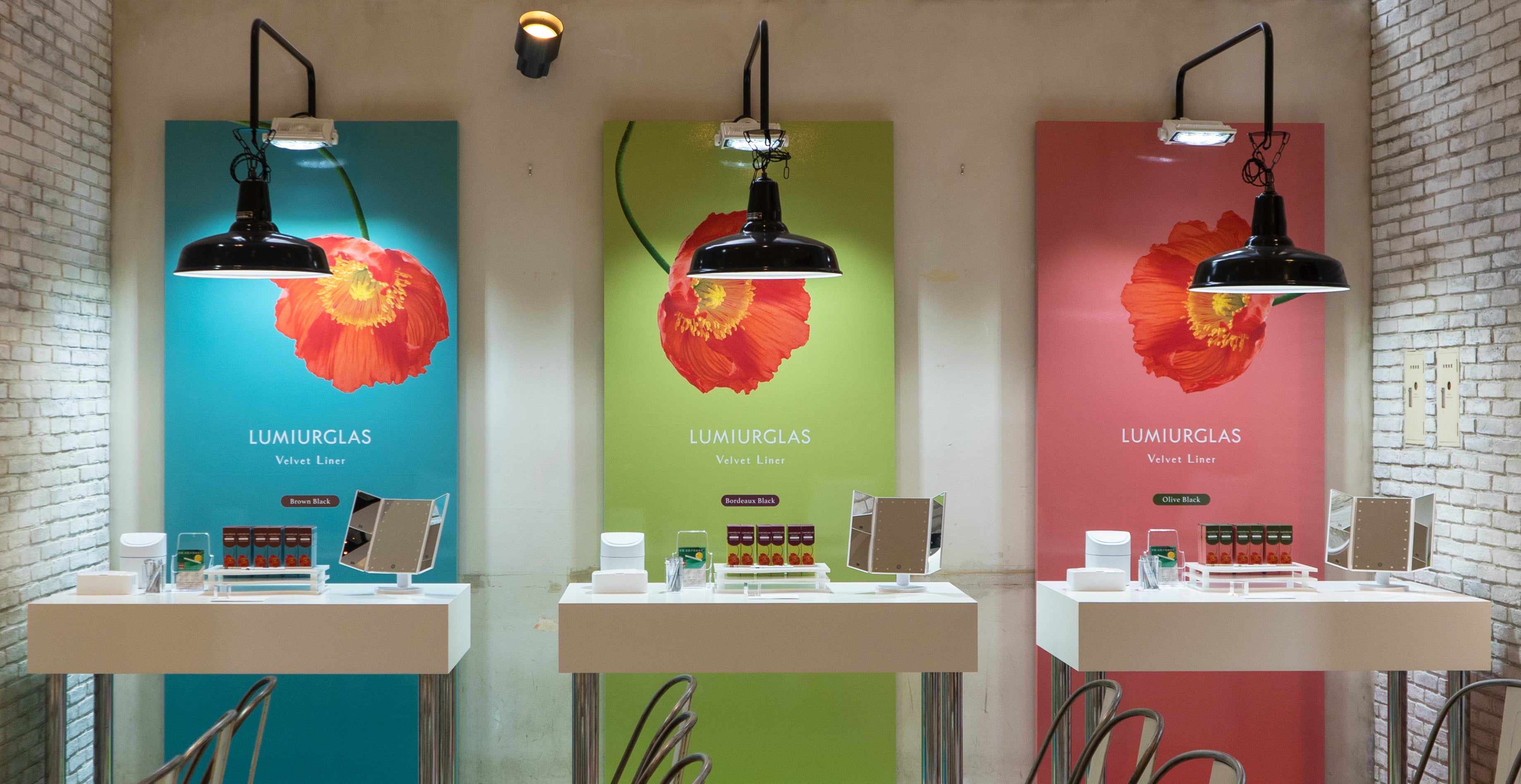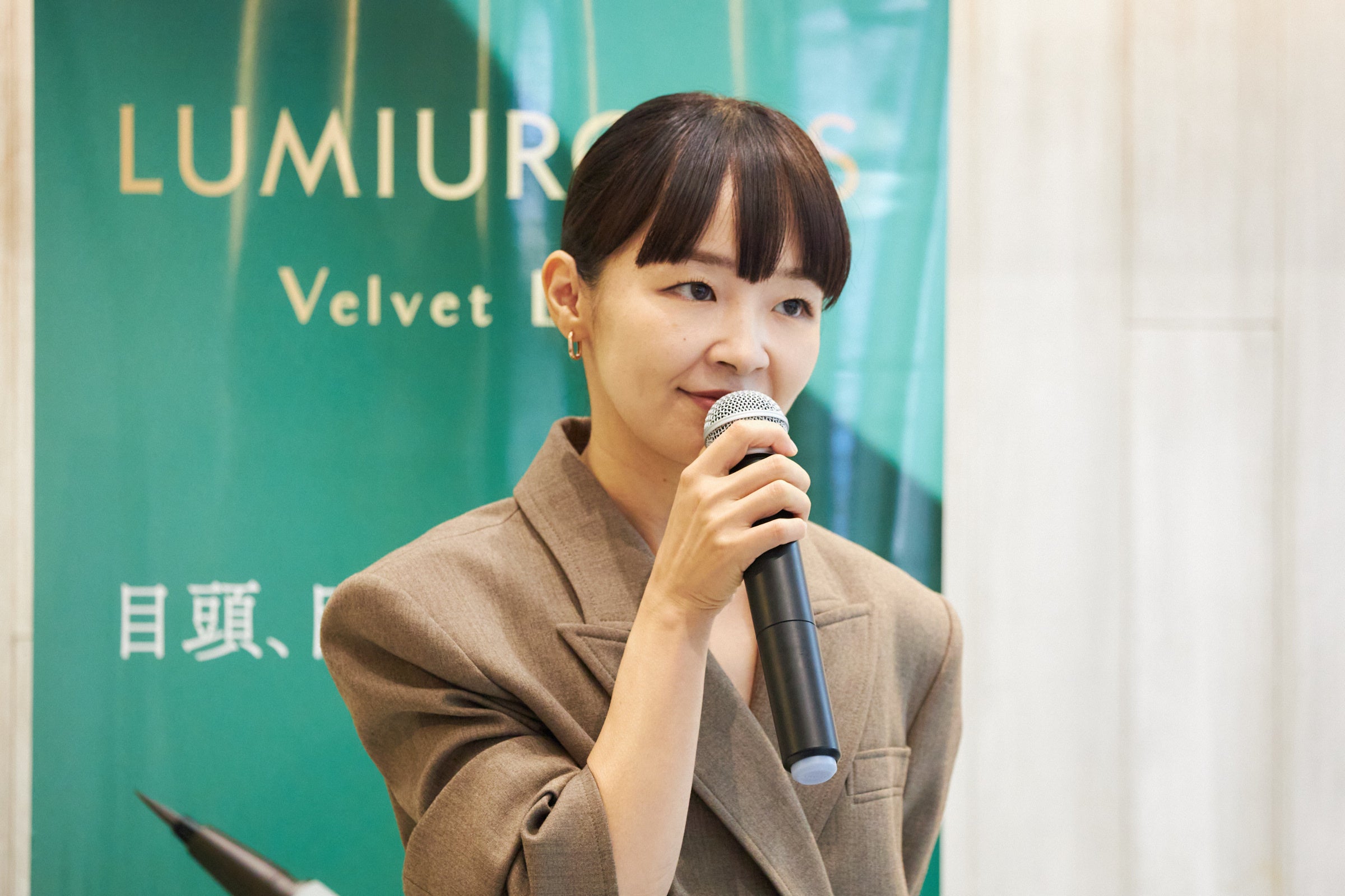 発表会冒頭には、ルミアグラス ブランドマネージャー影山千尋より、会社・ブランド説明、新商品の紹介を行いました。「ルミアグラスの新商品ベルベットライナーは、京都産シルクを配合し徹底的になめらかな質感と描きやすさを追求した商品です。」とベルベットライナーの特徴説明、ラインナップ紹介を行い、リキッドアイライナー開発にかける想いを語り締め括られました。