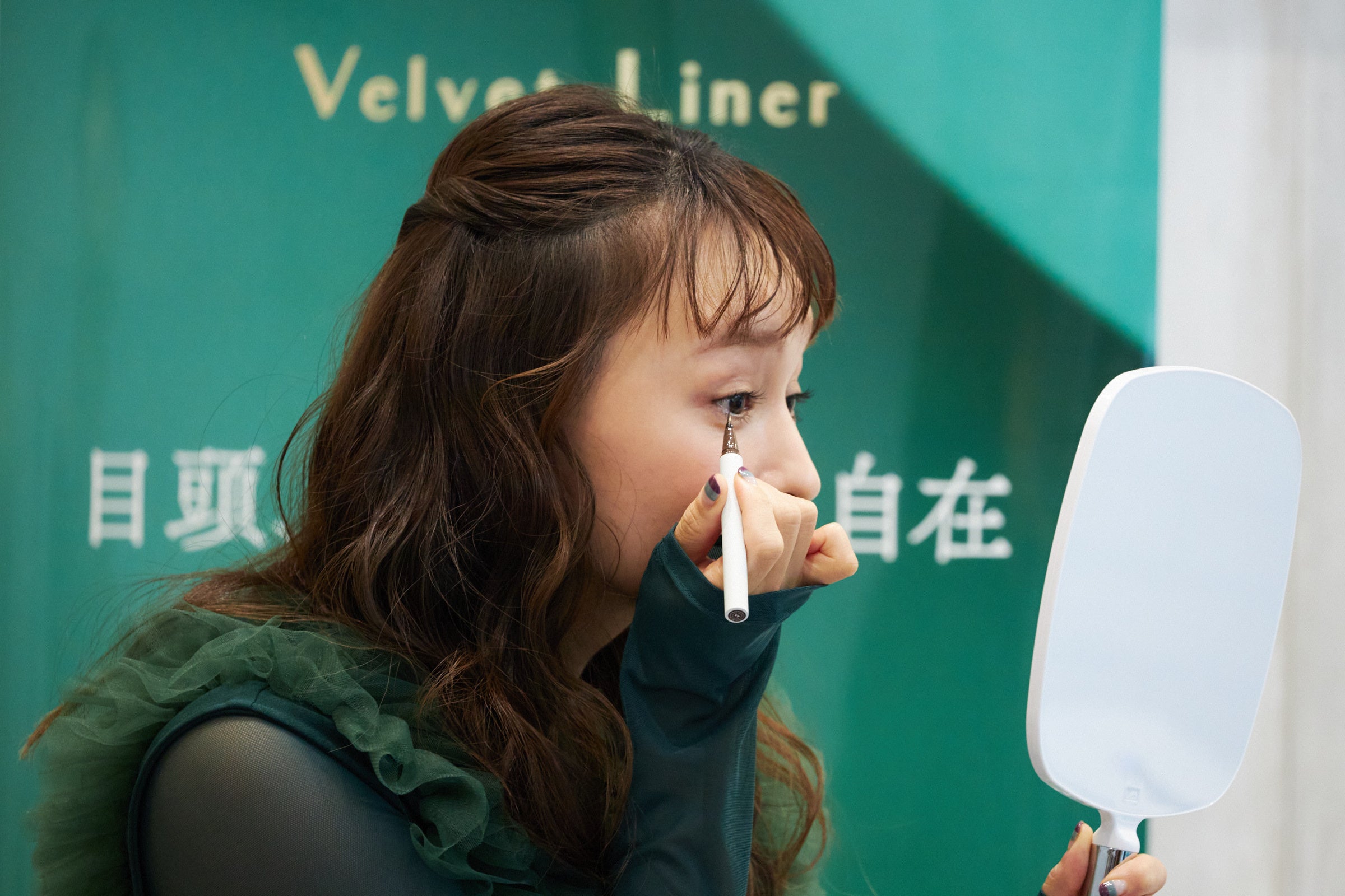 わたなべ麻衣さんご自身により右目の目尻アイラインを描いていただきました。緊張されているご様子でしたが、仕上がった目元を見て「本当に描きやすい!」と感想をいただきました。また、今回はブラウンブラックのカラーでメイクをしていただきましたが、「今度は、血色感のあるボルドーブラックを取り入れたい」と語っていただきました。