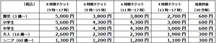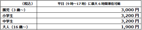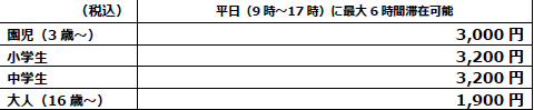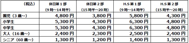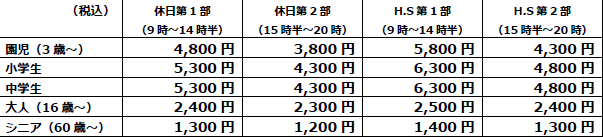 一般料金(税込):休日(土曜・日曜・祝日)およびH.S