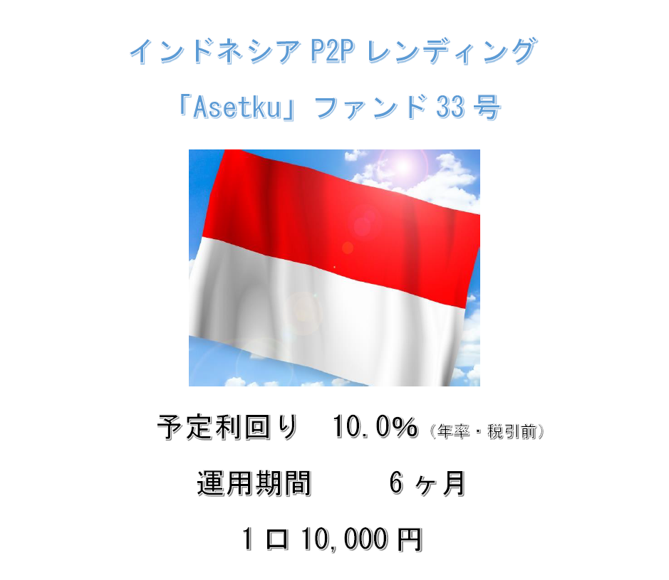 インドネシアP2Pレンディング「Asetku」ファンド33号募集開始!予定利回り10.0% (年率・税引前)