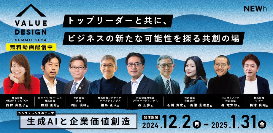 株式会社NEWh(本社:東京都千代田区、代表取締役社長:神谷 憲司)は、2024年11月29日 9:00~20:00で開催した、企業のリーダー人材向けオンラインカンファレンス「VALUE DESIGN SUMMIT 2024」のアーカイブ動画を公開しました。申込者限定で2025年1月31日(金)までの約2ヶ月間ご視聴いただけます。