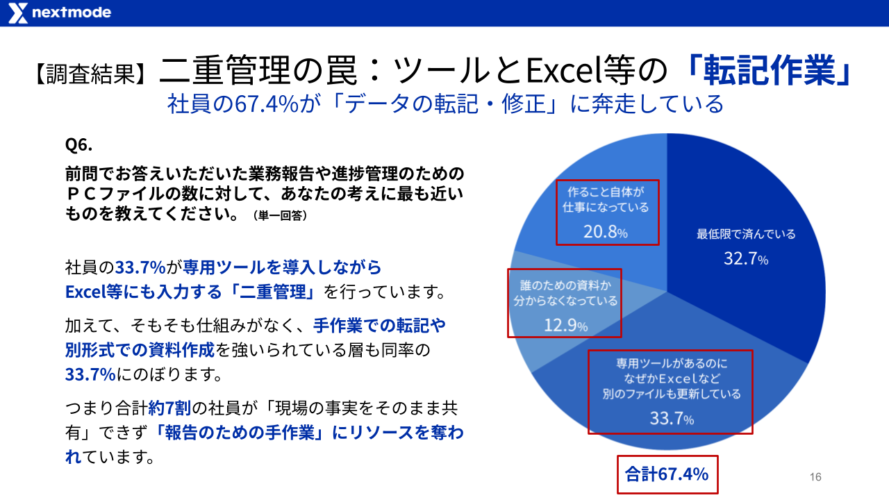 84.9%の社員が報告のためだけに「現場が不要だと感じているファイル」を扱っており、さらに67.4%がデータの転記や別ファイル作成といった手作業による「二重管理」から抜け出せていません。