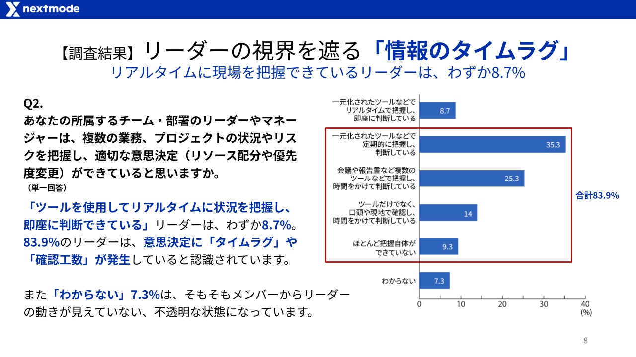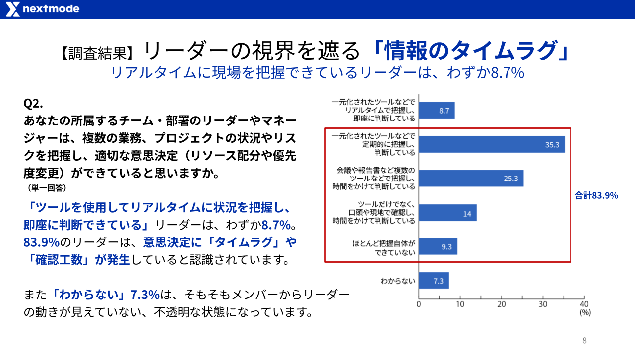 リアルタイムに状況を把握し即座に判断できているリーダーはわずか8.7%。83.9%の現場において、リーダーの意思決定にタイムラグや確認工数が発生していると認識されています。