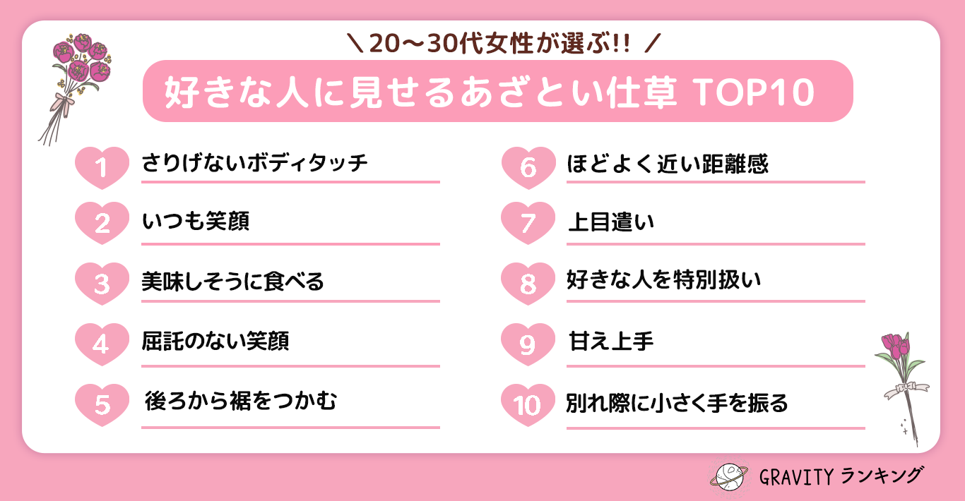 今回のテーマは、「好きな人に見せるあざとい仕草TOP10」