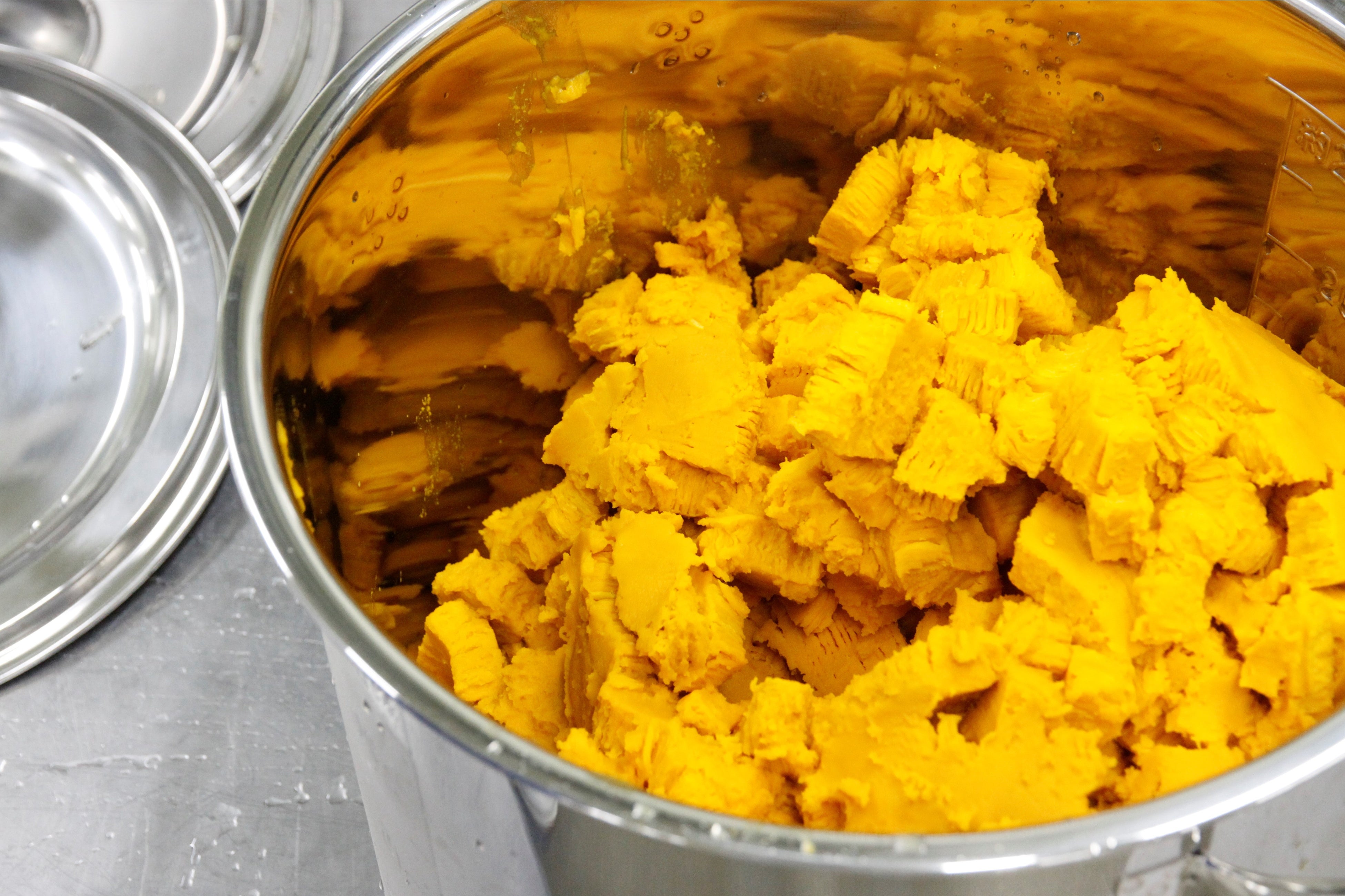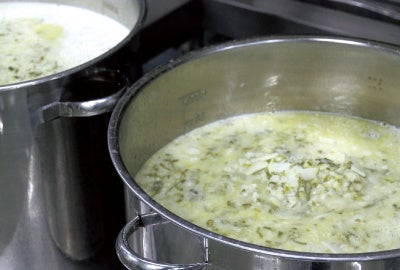 製造工程の最初に、ねぎの香りと甘みを引き出すために、バターでじっくりと炒めます。その後、じゃがいもを加えさらに炒めてから15分ほど煮込み、素材のとろみが出てきたら機械を使いねぎとじゃがいもをすり潰してなめらかにします。さらに煮込んでなめらかに仕上げています。