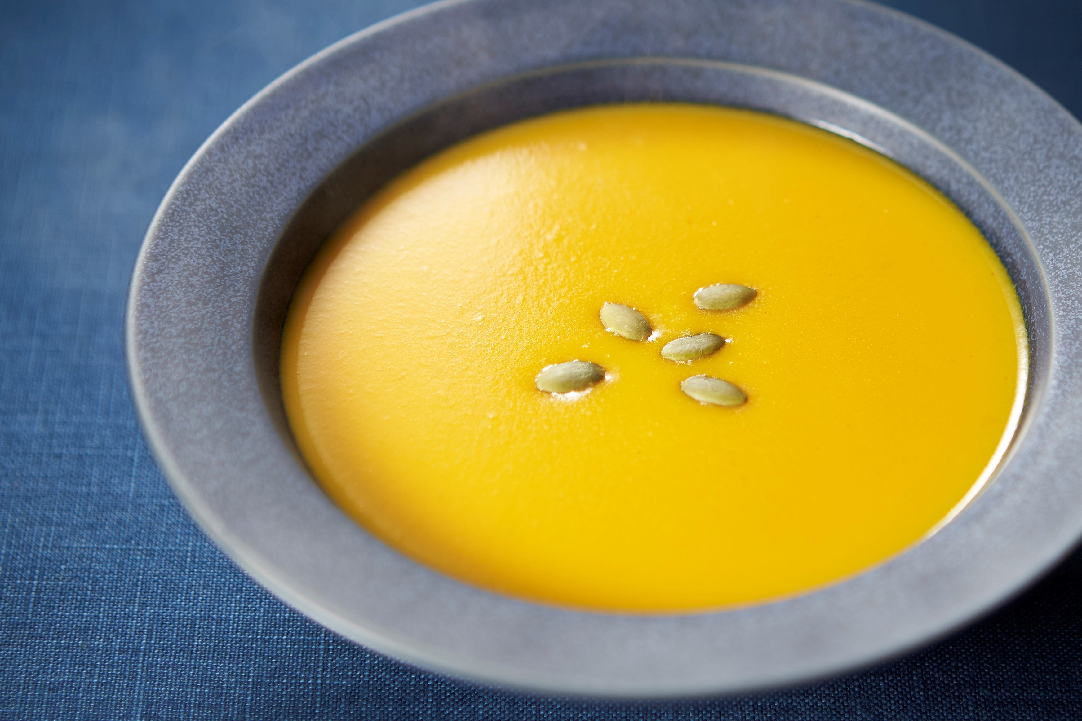 追熟して甘みが増したかぼちゃを一度、蒸してからなめらかなペーストにします。スープ中、スイートパンプキンペーストを30%使用し、かぼちゃのおいしさを生かしながら、炒めたたまねぎのペーストと生クリームを合わせ、クリーミーなポタージュに仕上げました。