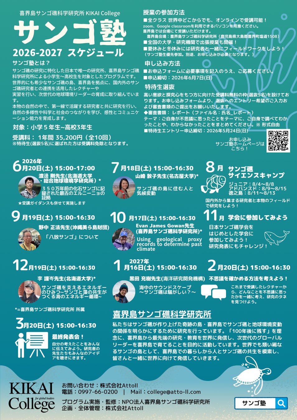 「100年後に残す」を理念に喜界島から最先端の研究・教育を世界に発信する「喜界島サンゴ礁科学研究所」が小学校5年生〜高校3年生を対象としたオンライン塾「サンゴ塾」の2026年度の受講生の募集を開始しました。