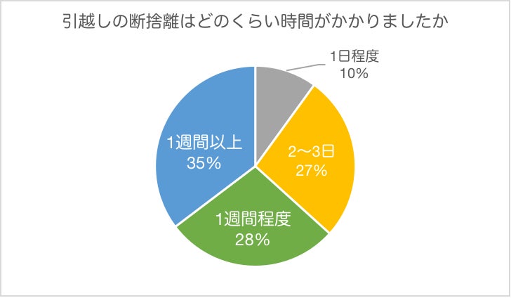 断捨離にかかった時間は、「1週間以上」がもっとも多く、次いで「1週間程度」かかっているということがわかりました。