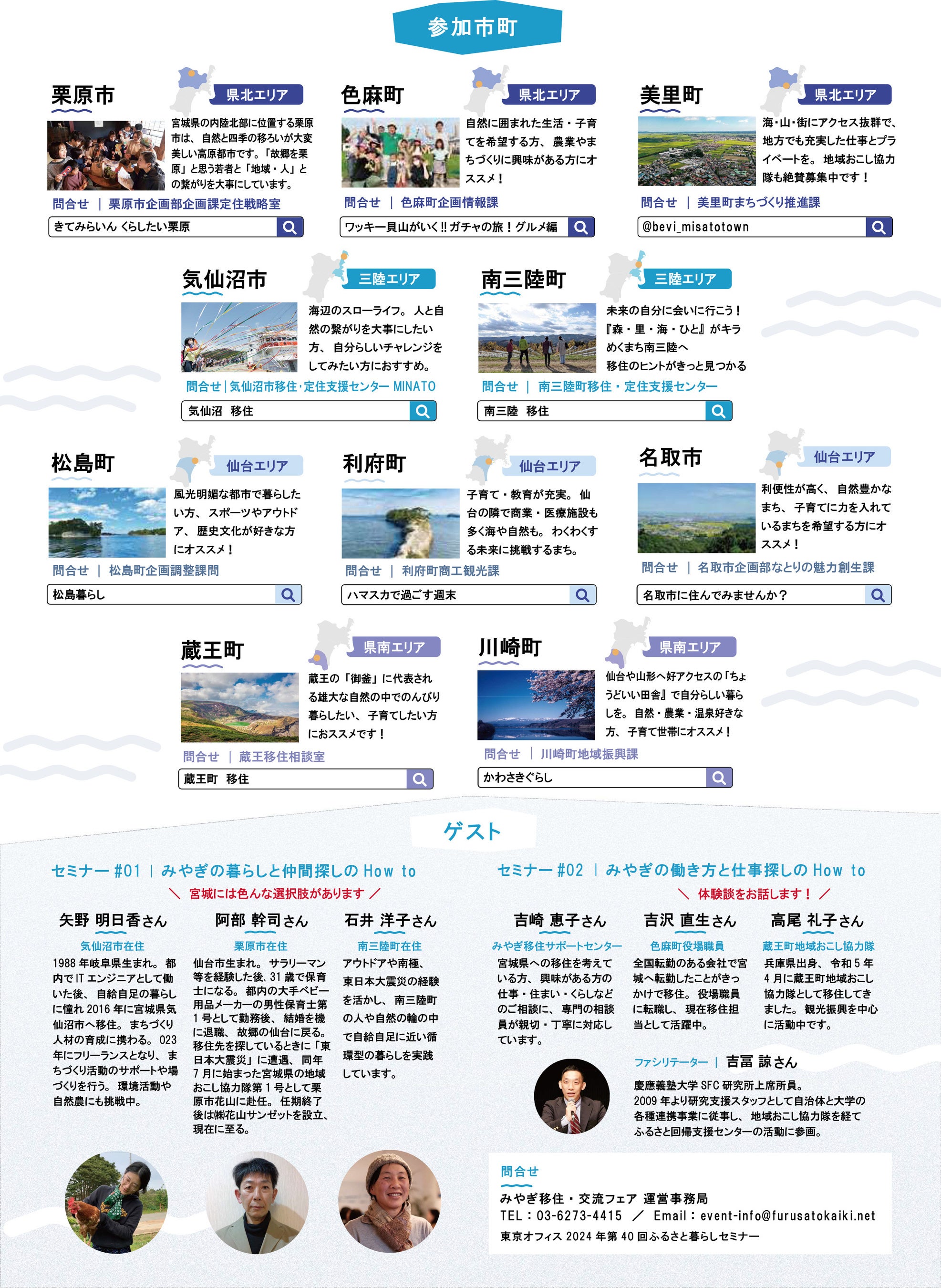 10市町(気仙沼市・名取市・栗原市・蔵王町・川崎町・松島町・利府町・色麻町・美里町・南三陸町)の移住担当者が生の情報をお伝えします。どんな地域? アクセスは? 仕事や住まいの見つけ方は? 支援は? 個別にお話を伺いますので、漠然としている状態でも大丈夫です。ちょっと興味があるという方、お気軽にご参加ください!