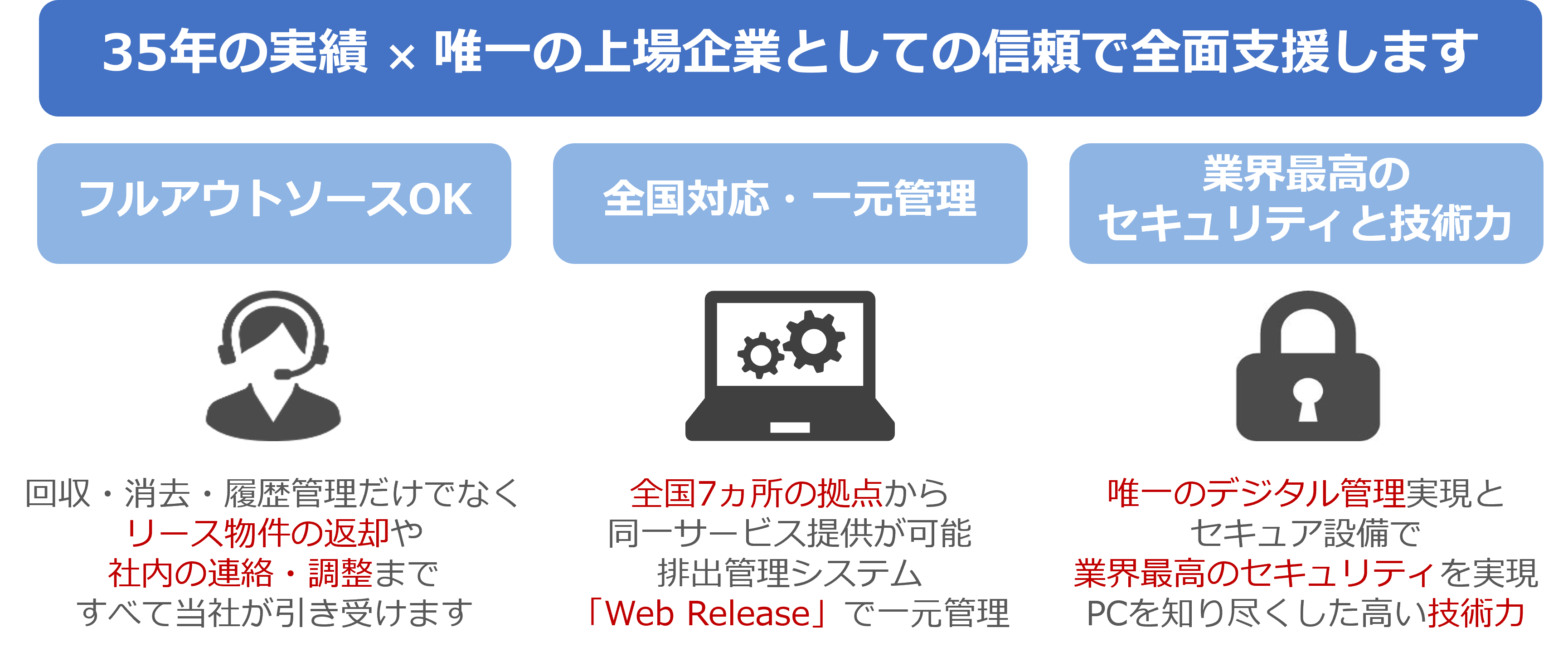 本サービスはIT機器排出時の課題をすべて解決することができるサービスです。