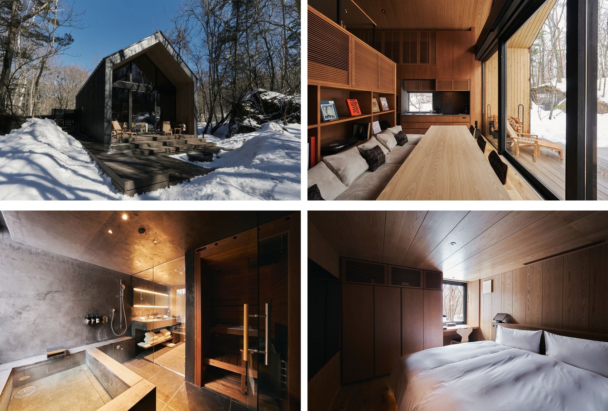テラスと共に建物の外に位置する、156 .55㎡と圧倒的な広さを確保したアウトドアリビングや、岩を削り出して作られた、一点物の岩風呂で味わう天然温泉が特徴。温泉で温まった後は、直結するテラスで外の風を浴びることも可能。さらに、大きく開かれたガラス越しに北軽井沢の四季を楽しめるサウナもご用意。隣接する浴室には水風呂も備え、充実のととのいを実現。