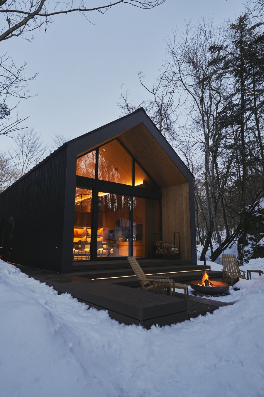 屋内面積が46.21㎡とミニマルな建築でありながら、天高が4.7mあり開放感がある設計。書斎にお風呂、寝室は2階で、サウナと外気浴のテラス、と必要なものが全て揃っている。28.62㎡のテラスの目の前には大自然が広がり、とても居心地のいい空間。大開口のリビングから、北軽井沢の四季の移ろいが楽しめる。借景の書斎やソロサウナで仕事にインスピレーションをもたらしたり、大切な相手とグラスを傾けたり、ゆっくりと時間が過ぎていく。