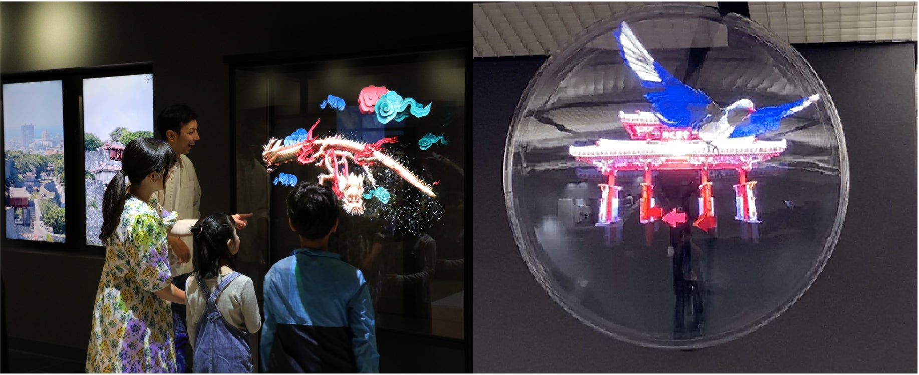 LED光源がライン状についたブレードを高速回転させ、光の残像によって映像を映し出し、インパクトのある3D映像をゴーグル等の装着なしで体験できる3Dホログラフィックディスプレイです。首里城にまつわるモティーフ(龍、火焔宝珠、瑞雲、正殿、守礼門等)の幻想的視覚体験が楽しめます。