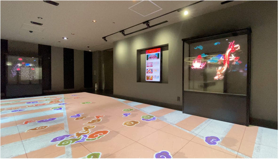 床には首里城の中庭広場「御庭(うなー)」に敷かれた磚(せん)と呼ばれるレンガが映し出されています。人が床に足を踏み入れると、「瑞雲(ずいうん)」と呼ばれる首里城の柱に描かれた模様が足元へと集まってきます。一定数の「瑞雲」が集まると、首里城正殿の屋根の装飾「火焔宝珠」や『紅型のモチーフで利用される「コウモリ」』、「ツバメ」が鮮やかな光とともに現れる仕組みになっております。
