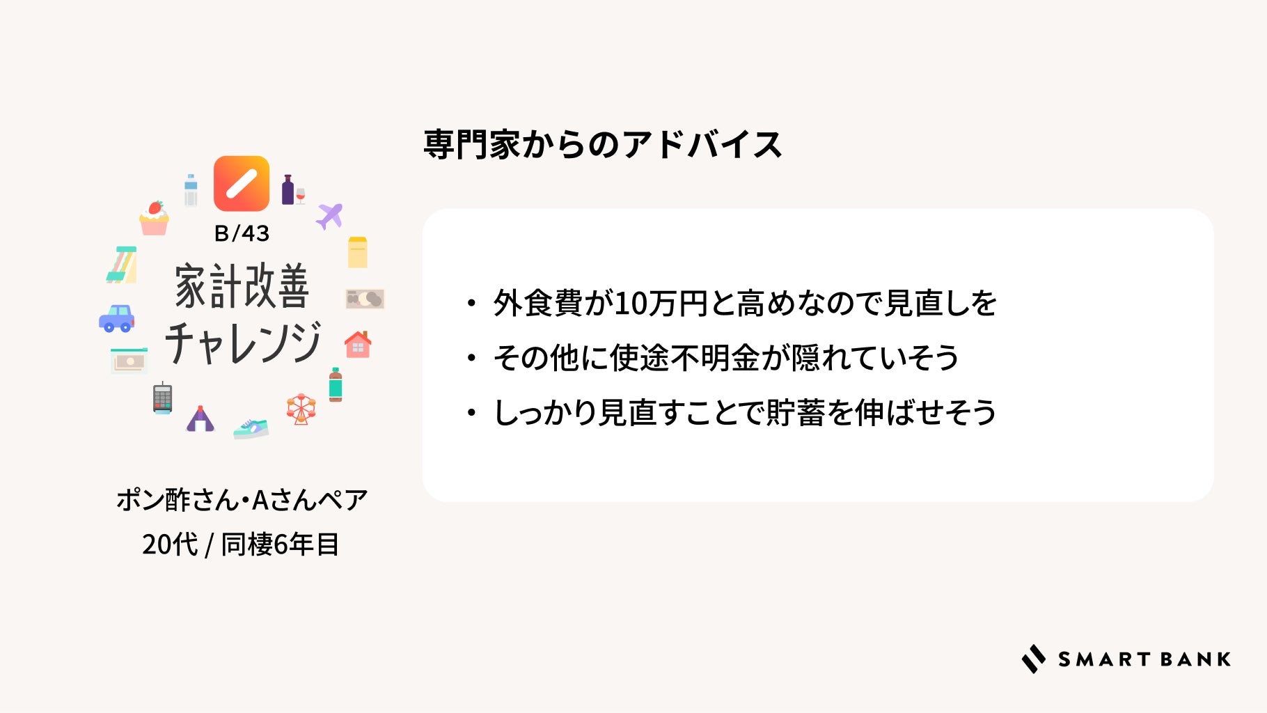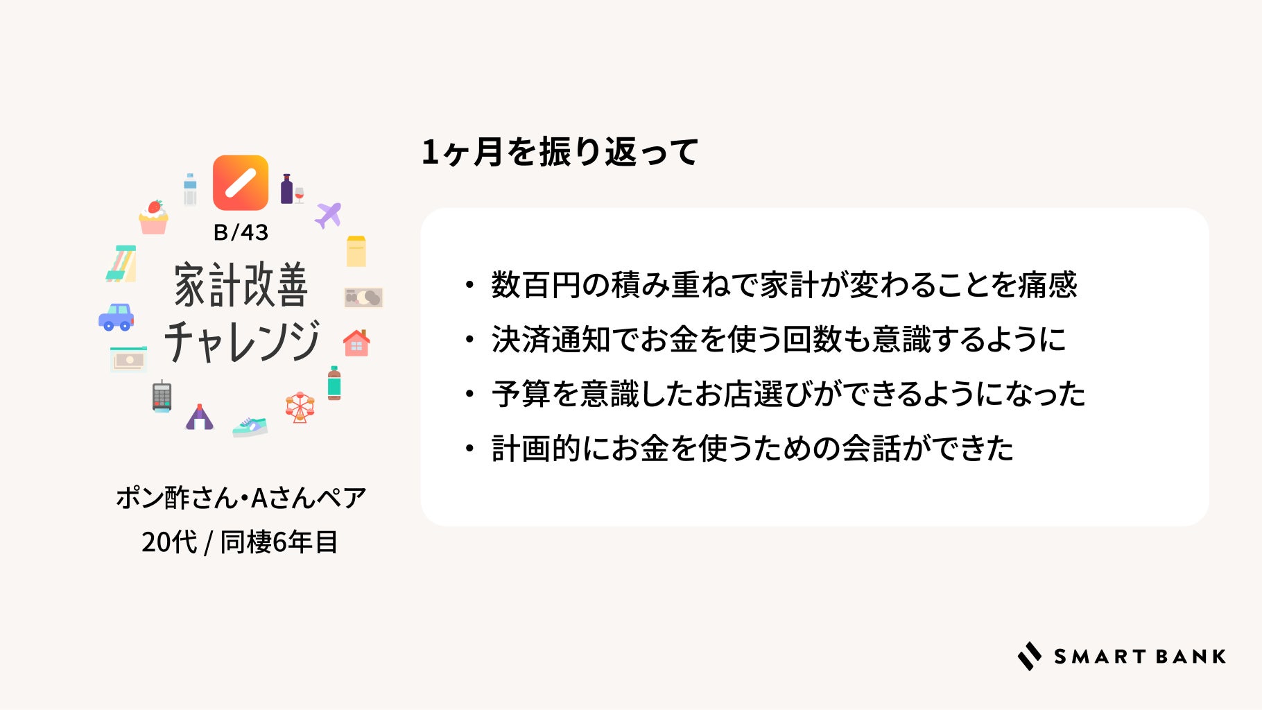 「ポン酢さん&Aさんペアは、1ヶ月という短い期間の中で、おふたりでB/43を利用しながら、どのようにやりくりをすれば予算内に収まるのか、どのような出費がムダなのか、出費の優先順位はどれかなど、家計のやりくりをするうえでとても大切なところに気付かれたようですね。
