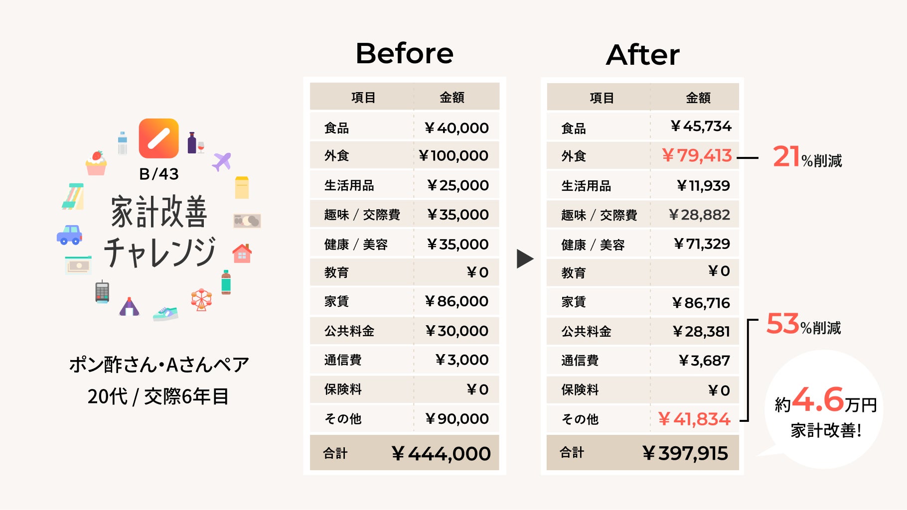 同棲カップルで月4.6万円の支出削減!家計簿プリカB/43、節約アドバイザー丸山晴美さんとの家計改善チャレンジ第二弾結果を発表