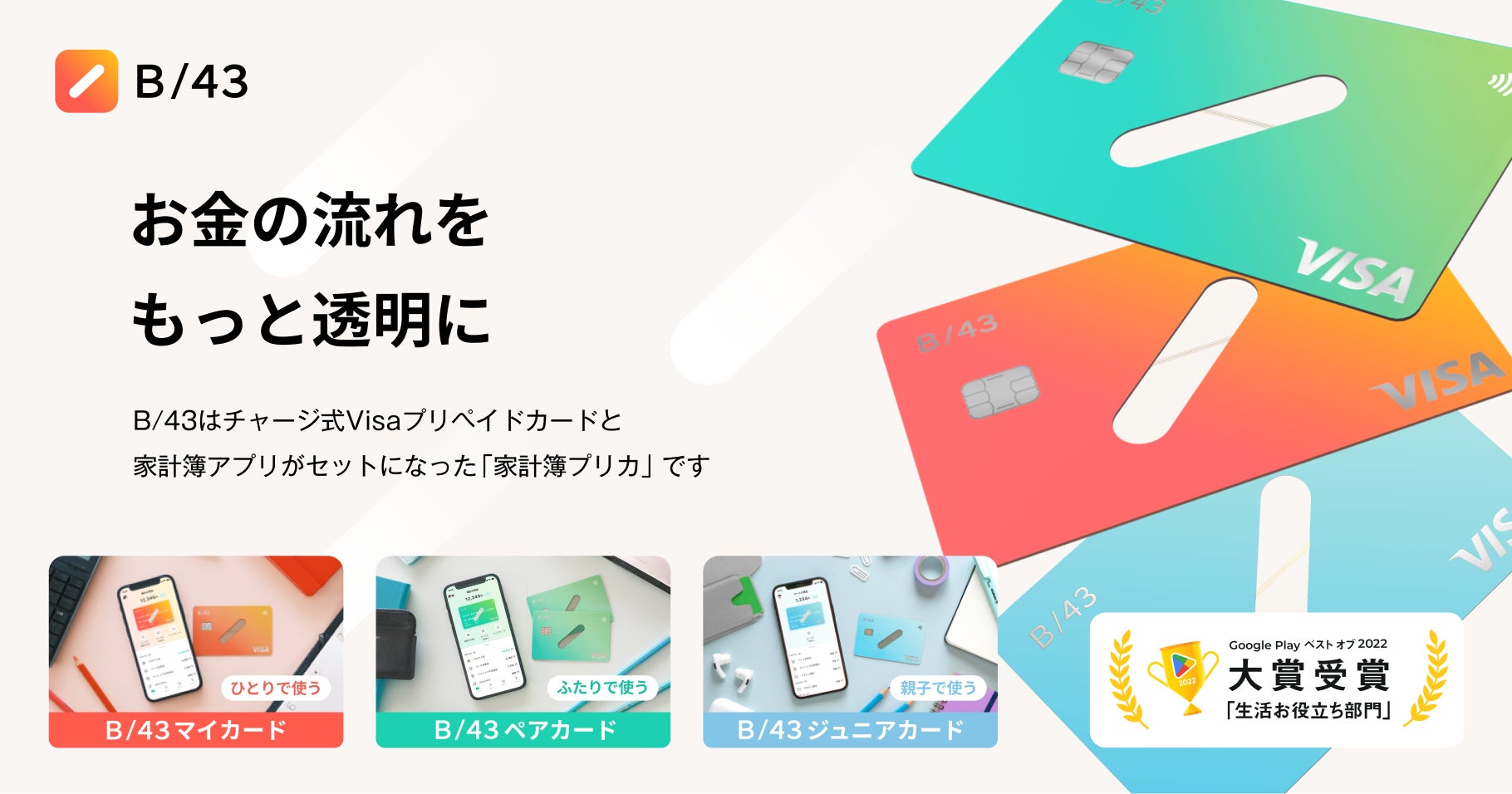 「B/43」とは、Visaプリペイドカードと家計簿アプリがセットになった新しい支出管理サービスです。毎月の予算をプリペイドカードにチャージして支払いを行うだけで、アプリに支出の明細がリアルタイムで反映されるため、簡単に支出管理が可能です。夫婦や同棲カップルで使える「B/43ペアカード」では、一つの口座で二つのカードが作れて面倒な割り勘や現金のやり取りが不要になり、ふたりで一緒に支出を確認できます。また、親子向けの「B/43ジュニアカード」ではキャッシュレスでお小遣いを渡し、親子で一緒にお金の管理ができます。(参照URL:https://b43.jp/)