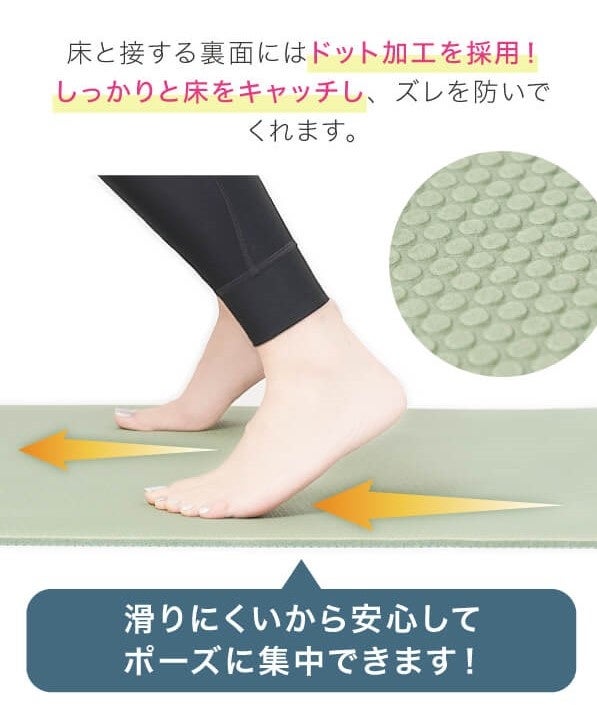 床と接する裏面には、ドット加工が施されており、運動中のマットのズレを防いでくれます。
