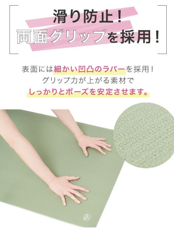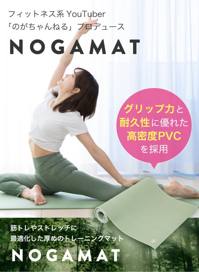フィットネス系人気YouTuberとしてご活躍されている「のがちゃんねる」監修のもと、初心者から上級者まで満足して使用できる理想のヨガマットが完成しました。本製品は「汗で滑る」「マンションで音が気になる」「身体が床にあたって痛い」などエクササイズ中のお悩みを全て払拭しました。サイズは幅が広めになっており、男女関係なく使用できる仕様です。カラーはインテリアに馴染みやすいおしゃれなグリーンで、デザインにもこだわりが詰ま っています。