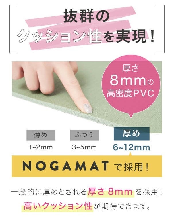厚さ8mmの高密度PVCを使用しているため、クッション性が高く、体への負担を軽減します。厚手のマットは硬い床や冷たい床に触れず、快適に運動することができます。また、抜群のクッション性で身体が沈み込まないため、長時間肘や膝をついても痛くなりません。