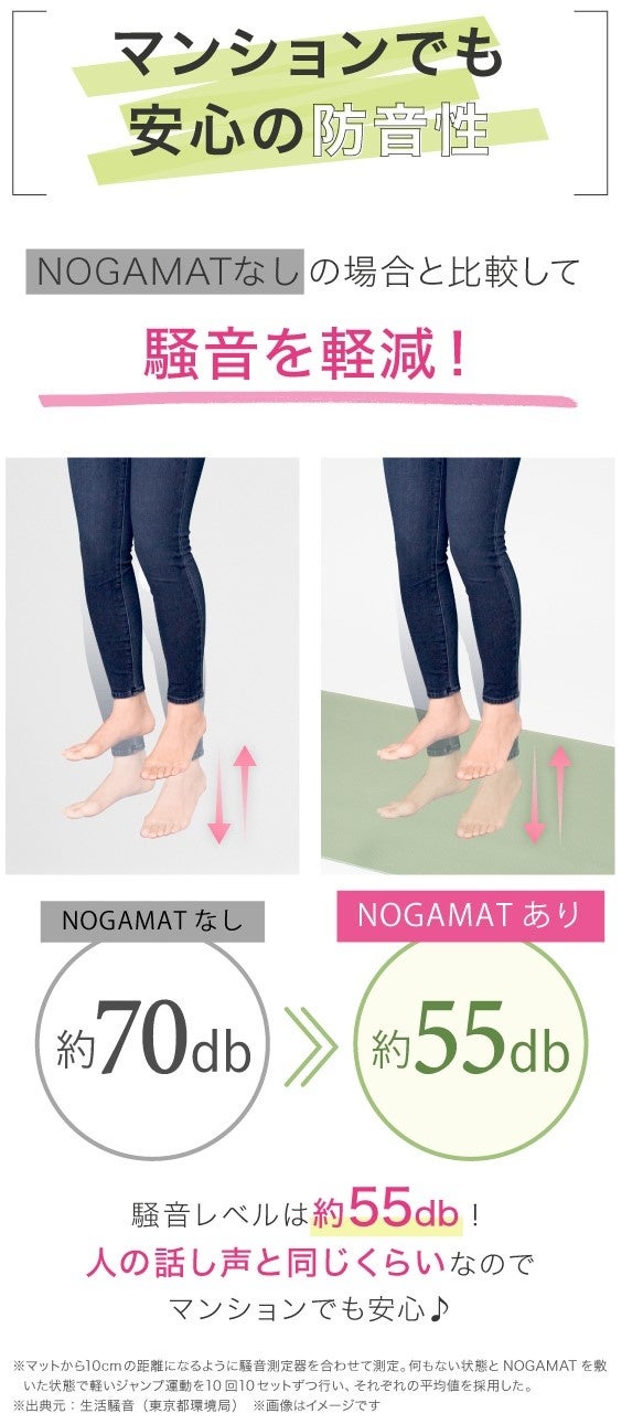 ※マットから10cmの距離になるように騒音測定器を合わせて測定。何もない状態とNOGAMATを敷いた状態で軽いジャンプ運動を10回10セットずつ行い、それぞれの平均値を採用した。/出典元:生活騒音(東京都環境 局)/画像はイメージです。