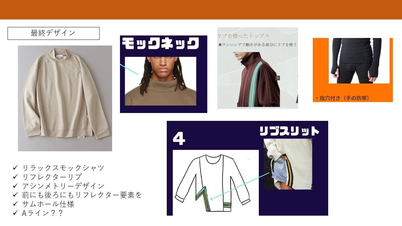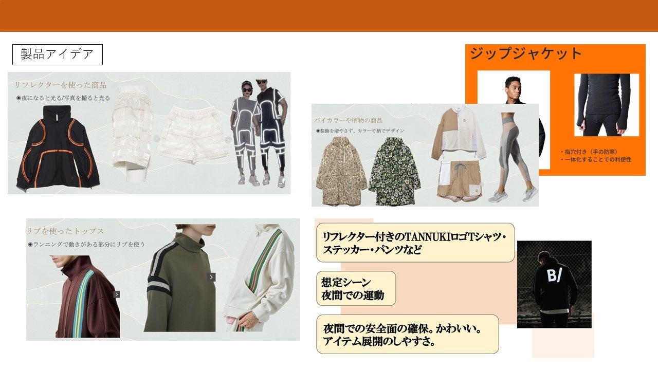 第二段階として、学生の皆さんが持ち合わせている感性の部分や、学んでいるファッション要素を加えたランニングウェアの開発をTANNUKIの企画チームと共に行いました。